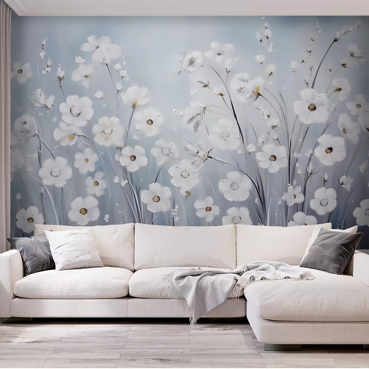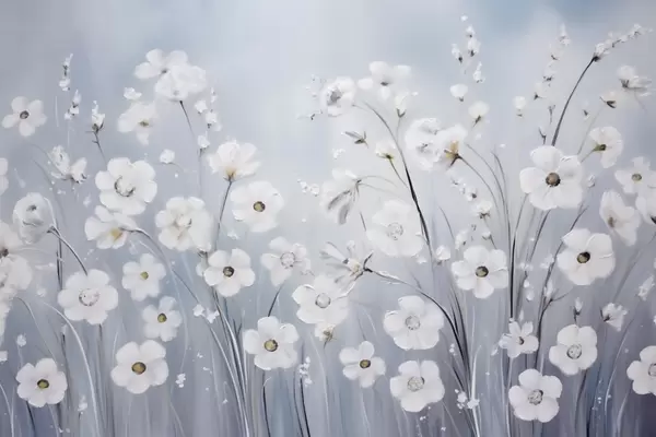 Fototapeter Hvite blomster mot en blå himmel i oljemaleristil Nr. w09516