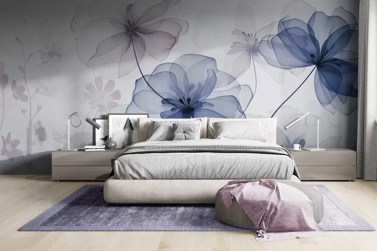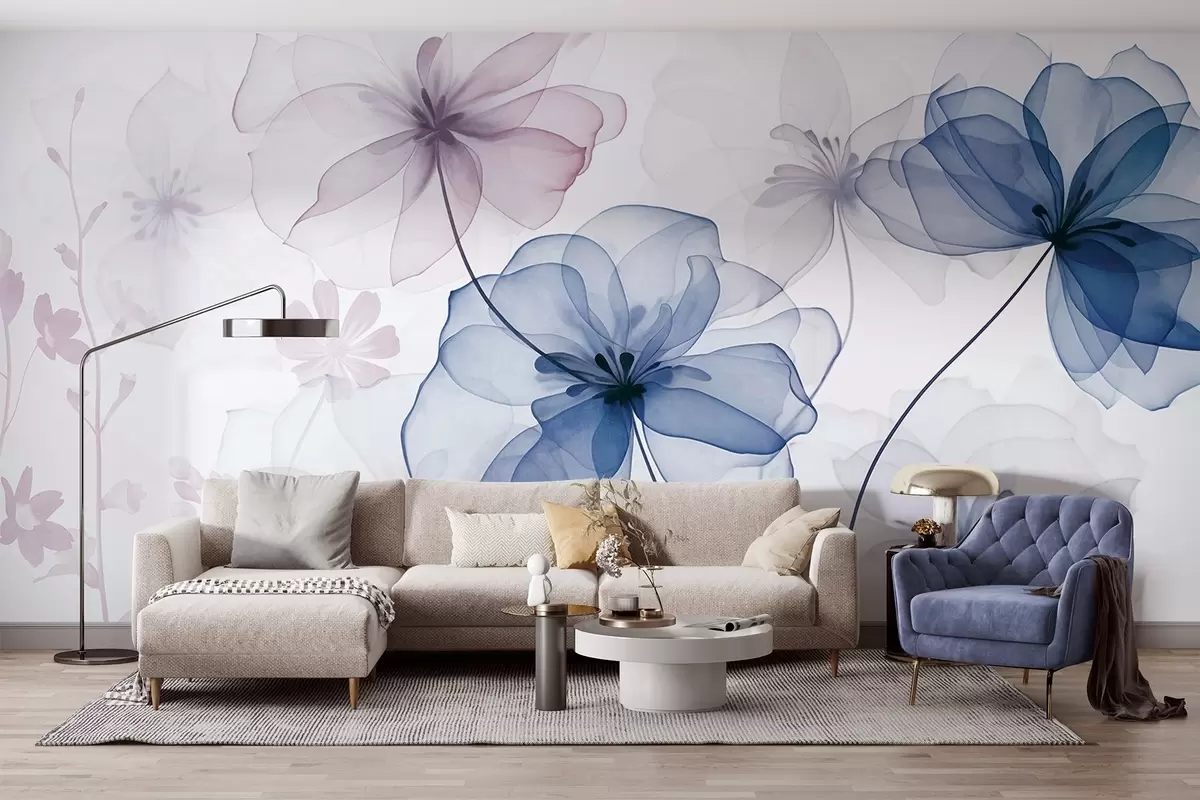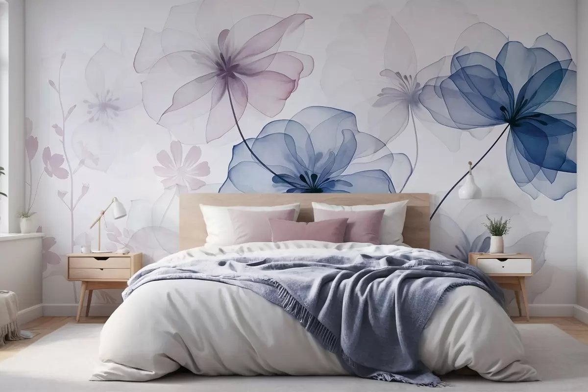 Fototapeter Gjennomsiktige blomster med dempede blå og rosa kronblader, lange stilker, lys bakgrunn, myke farger, strukturert blomsterdesign Nr. w09529v1