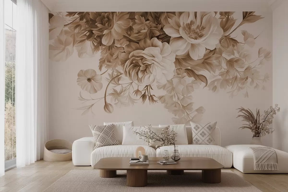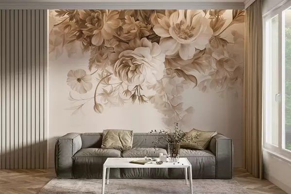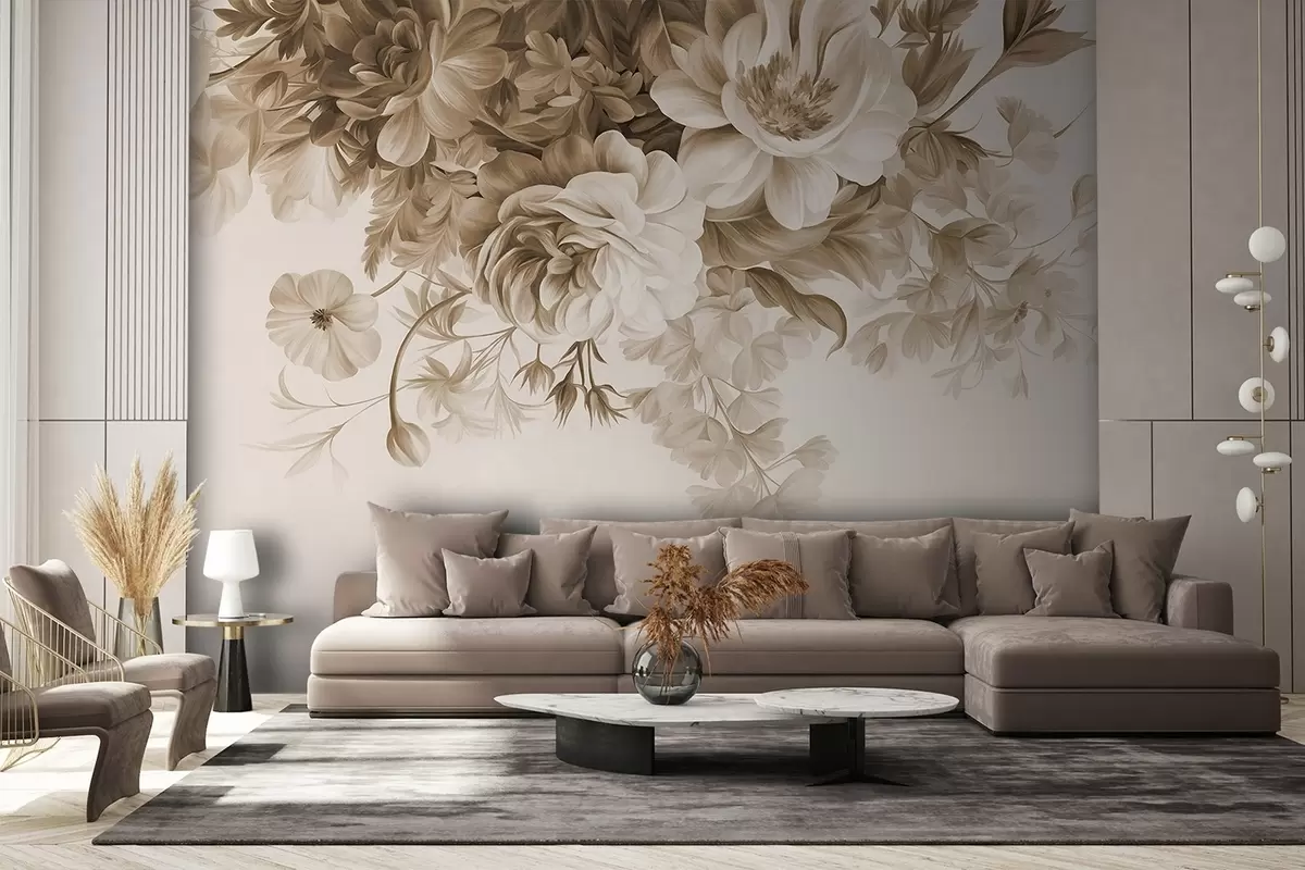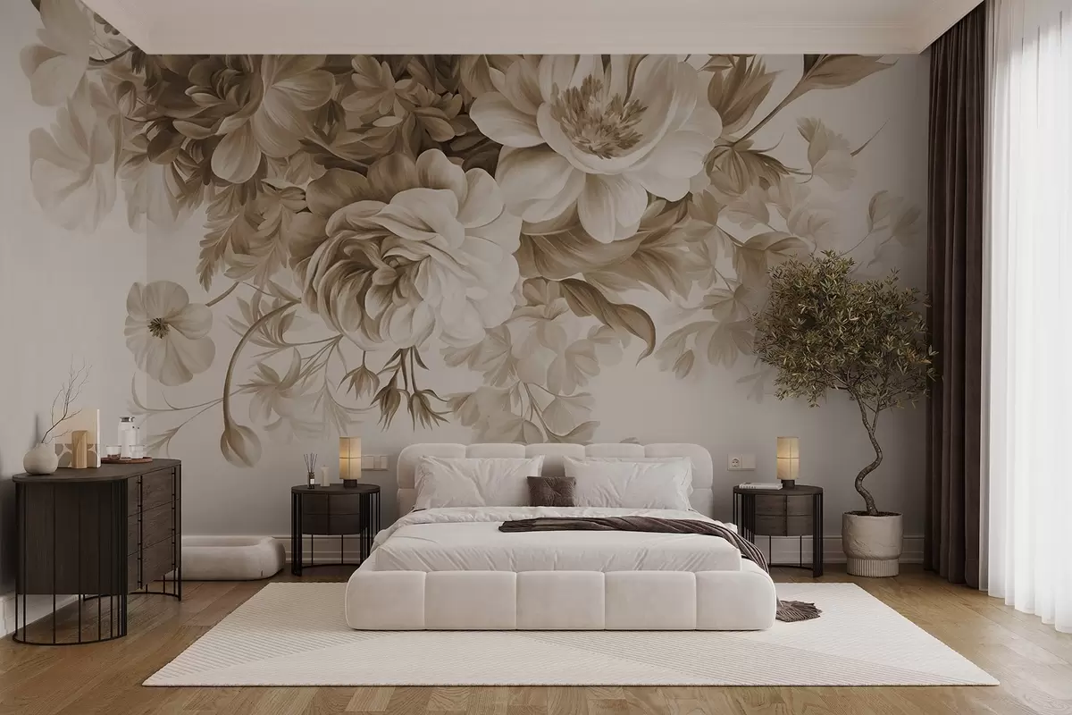 Fototapeter Vintage blomsteroppsats med roser, pioner og andre teksturerte blomster med løvverk, på en lys bakgrunn Nr. w09532v1