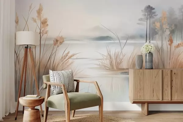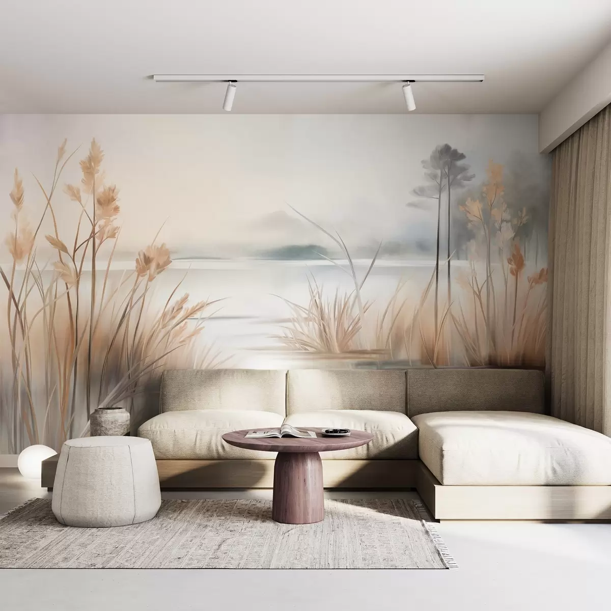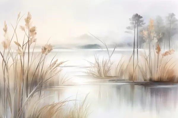 Fototapeter Landskap med en innsjø og høyt gress i forgrunnen, fjell i bakgrunnen, myke farger, strukturert Nr. w09534