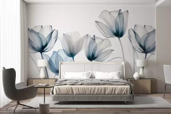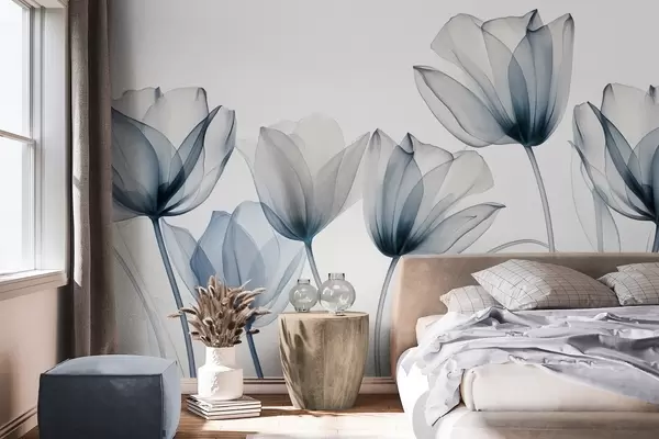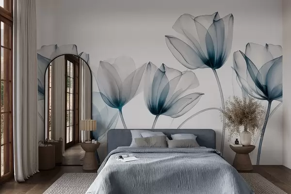 Fototapeter Gjennomsiktige blå og hvite tulipanblomster med lange stilker, mot lys bakgrunn, delikat og strukturert blomsterkunst Nr. w09538