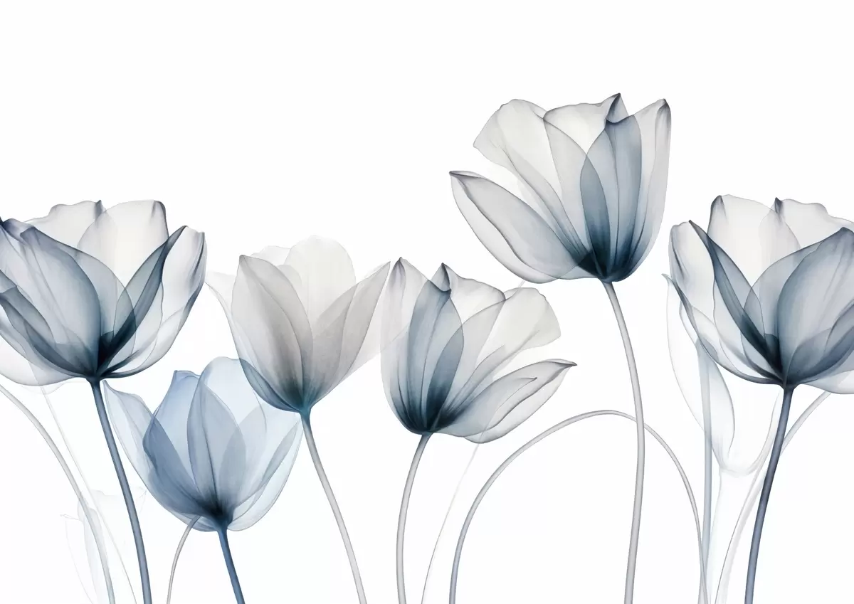 Fototapeter Gjennomsiktige blå og hvite tulipanblomster med lange stilker, mot lys bakgrunn, delikat og strukturert blomsterkunst Nr. w09538