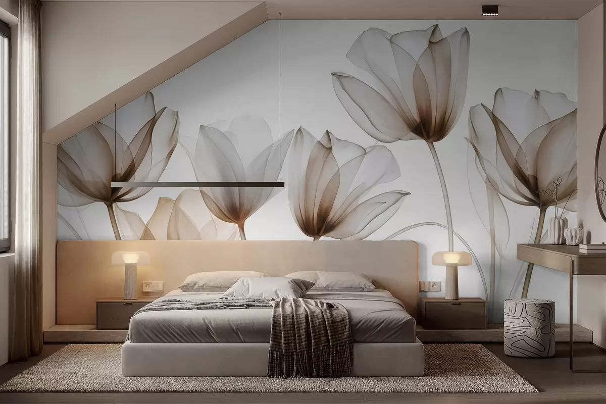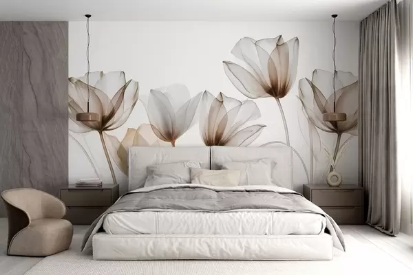 Fototapeter Gjennomsiktige brune og hvite tulipanblomster med lange stilker, mot lys bakgrunn, delikat og strukturert blomsterkunst Nr. w09538v1