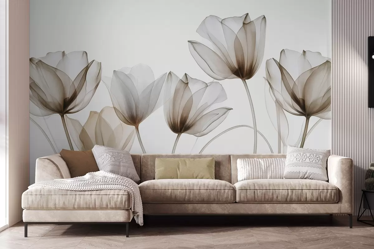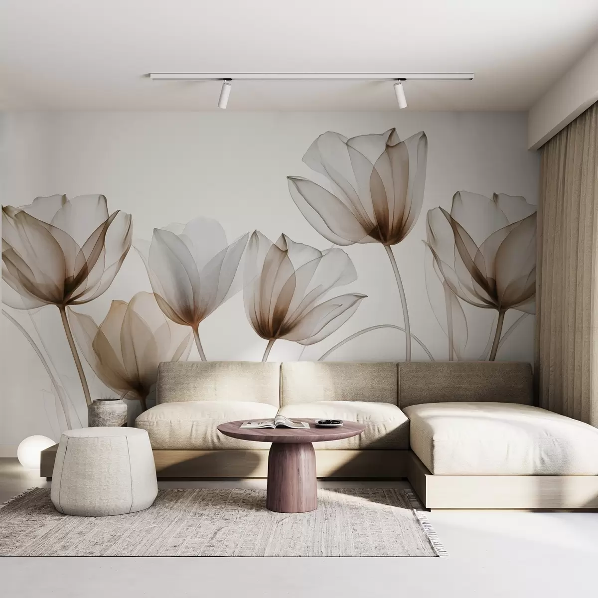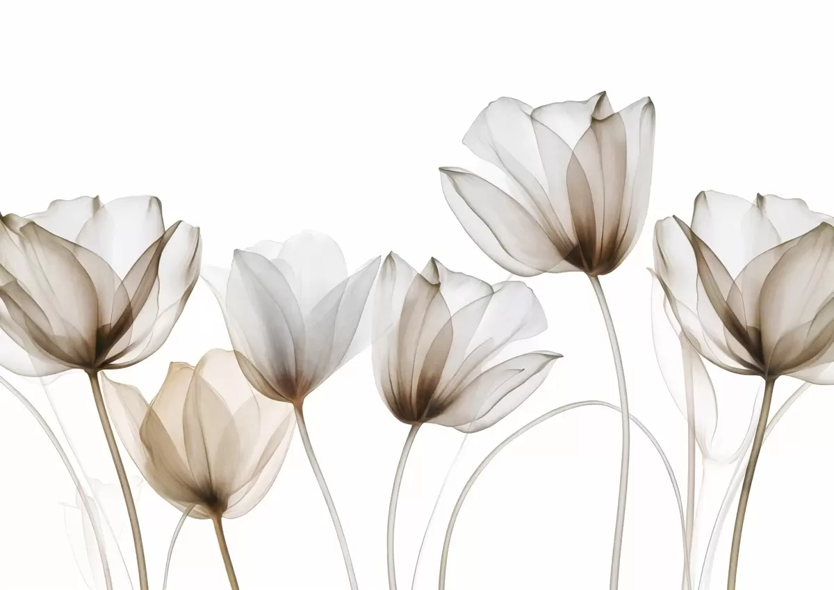 Fototapeter Gjennomsiktige brune og hvite tulipanblomster med lange stilker, mot lys bakgrunn, delikat og strukturert blomsterkunst Nr. w09538v1