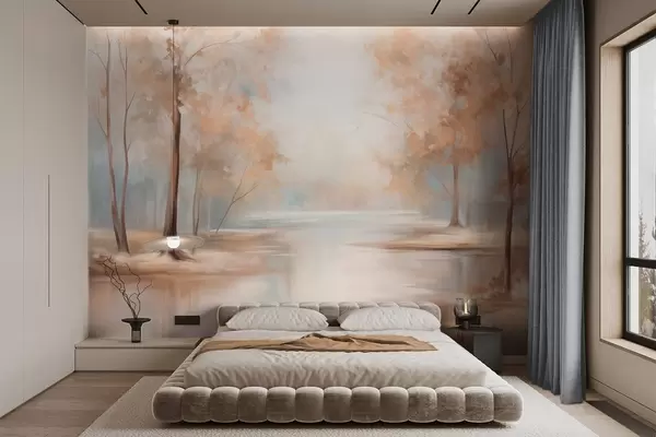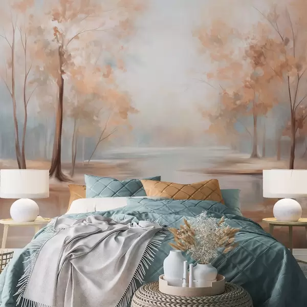Fototapeter Høstlig landskap med trær og en elv, myke farger, lys og luftig atmosfære, fredelig og rolig scene Nr. w09541