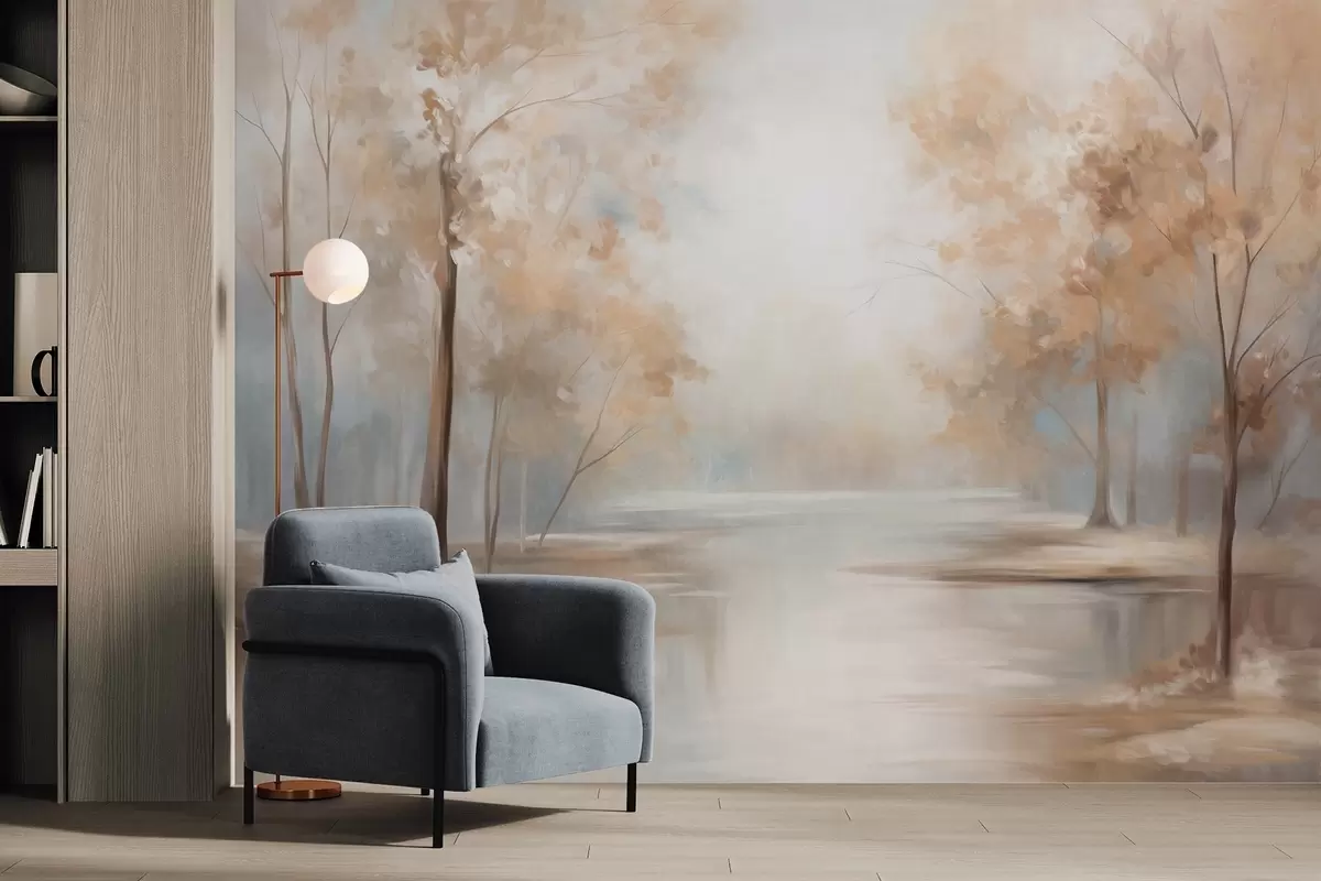 Fototapeter Høstlig landskap med trær og en elv, myke farger, lys og luftig atmosfære, fredelig og rolig scene Nr. w09541