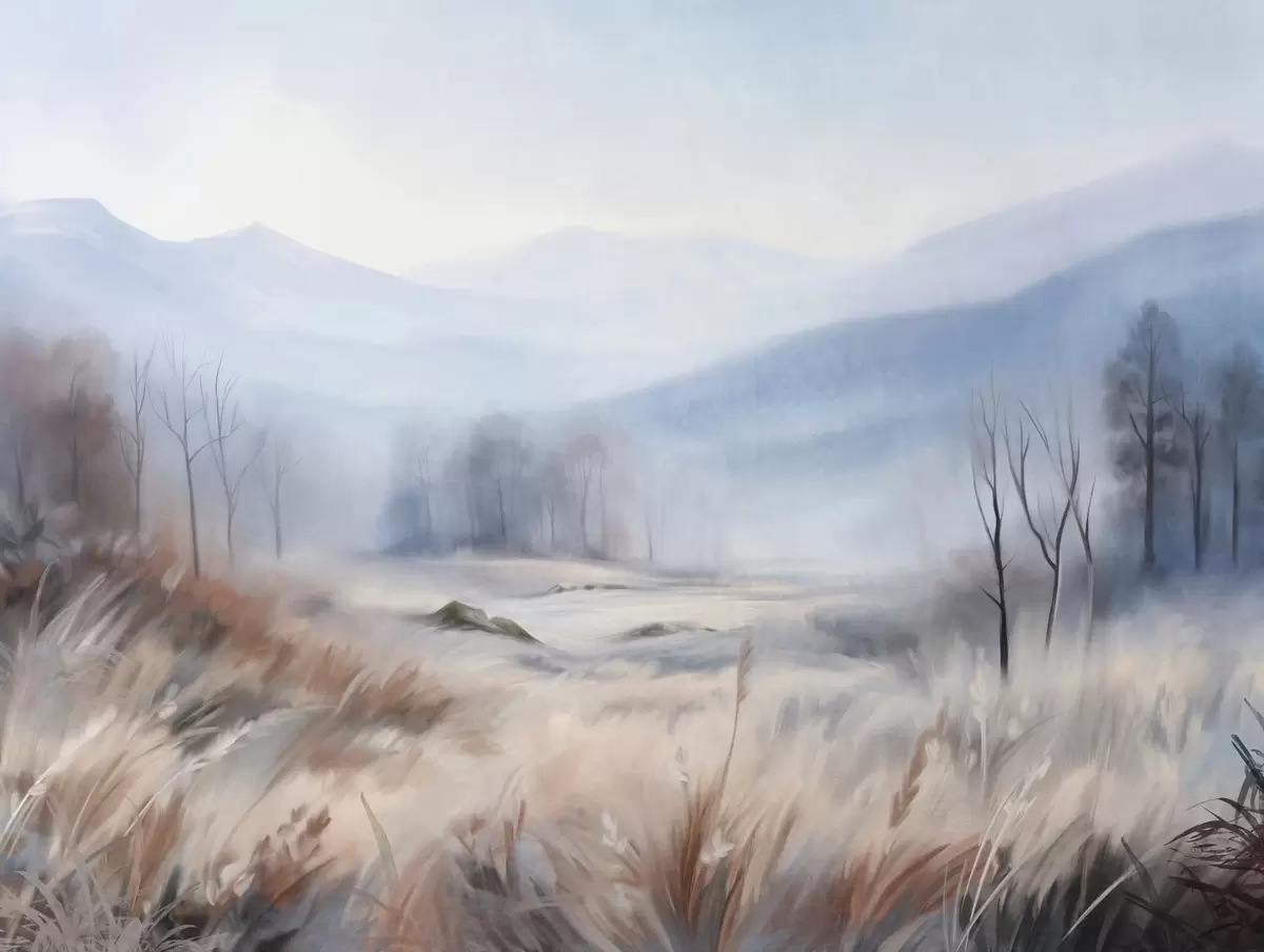Fototapeter Teksturert landskap med tørt gress i forgrunnen og trær i bakgrunnen, med fjell i det fjerne Nr. w09542