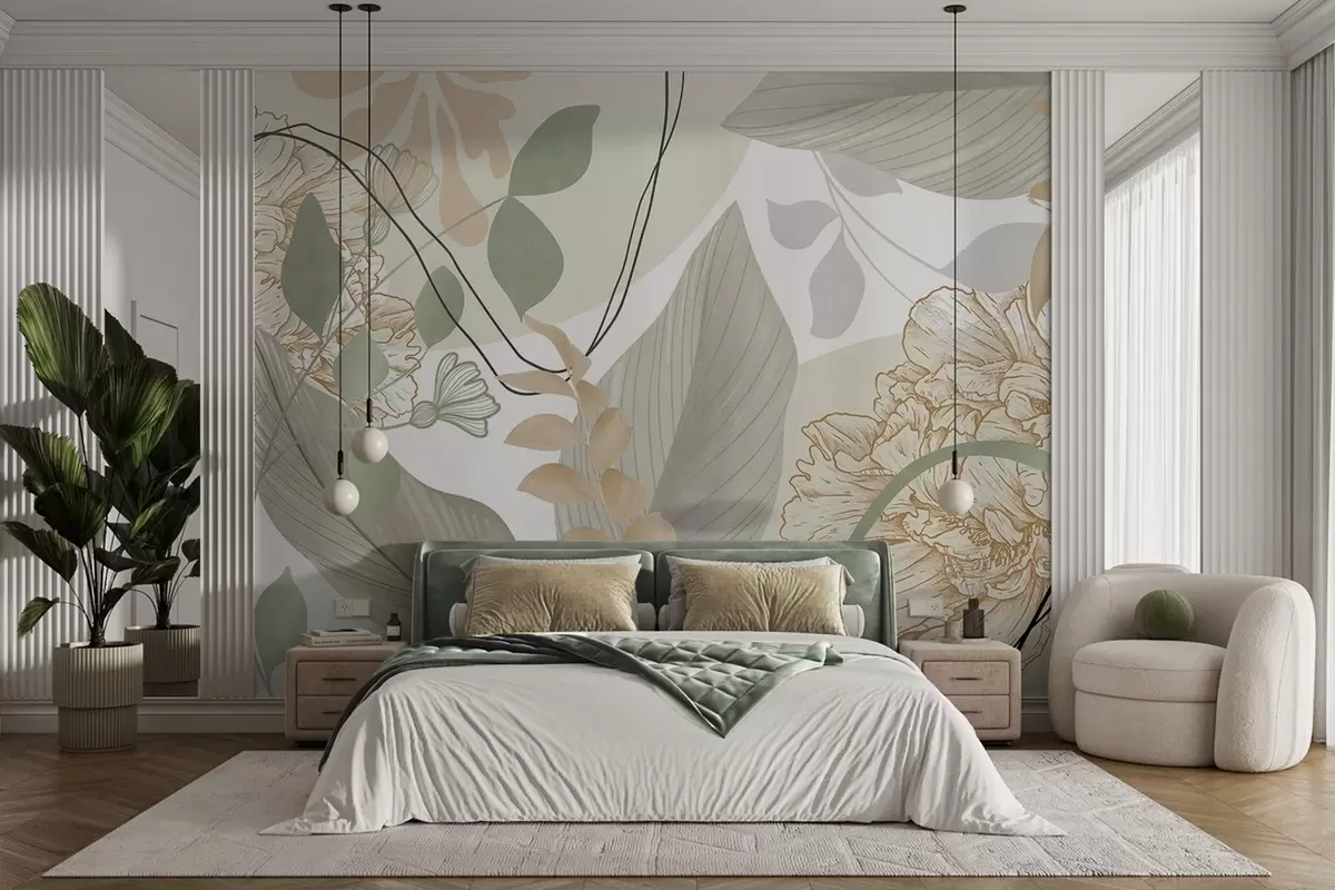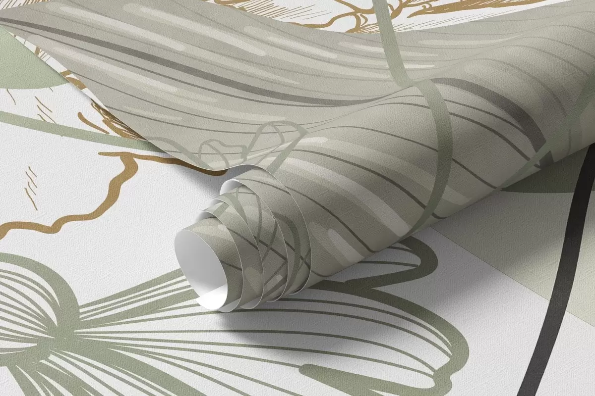 Fototapeter Abstrakt blomstertrykk med store blader i dempede grønn- og gultoner med tynne svarte linjer og hvite blomsterkonturer. Nr. w09544v2