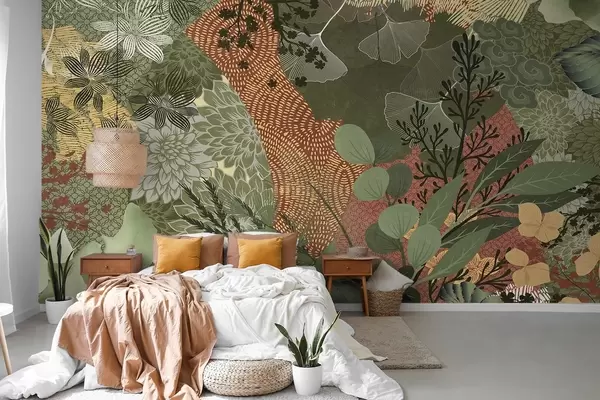 Fototapeter Abstrakt teksturert collage av botaniske elementer med blader, blomster og organiske teksturer, i nyanser av grønt og brunt. Nr. w09545