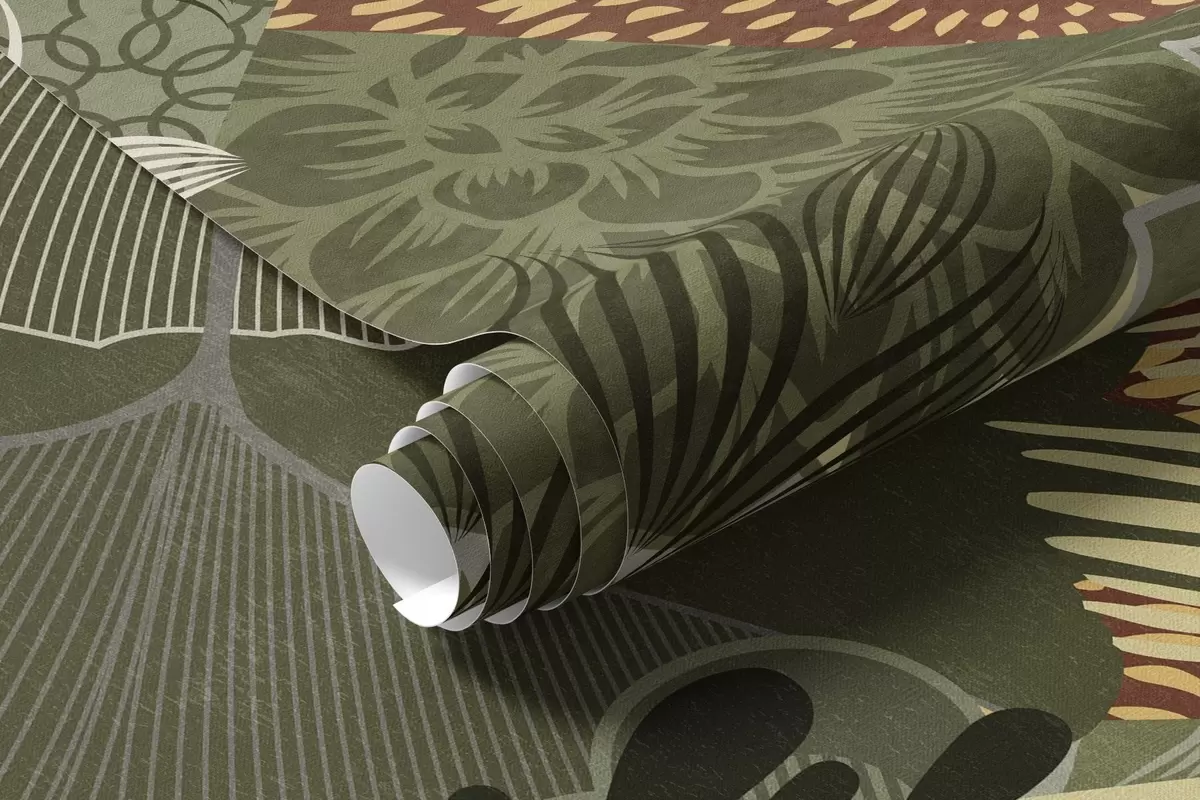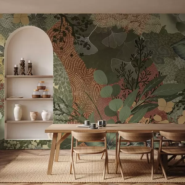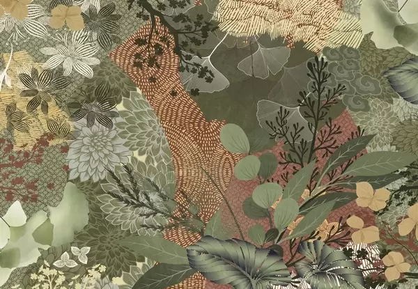 Fototapeter Abstrakt teksturert collage av botaniske elementer med blader, blomster og organiske teksturer, i nyanser av grønt og brunt. Nr. w09545