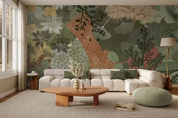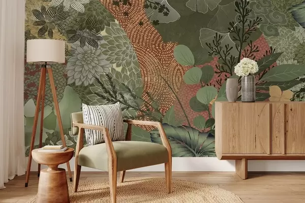 Fototapeter Abstrakt teksturert collage av botaniske elementer med blader, blomster og organiske teksturer, i nyanser av grønt og brunt. Nr. w09545