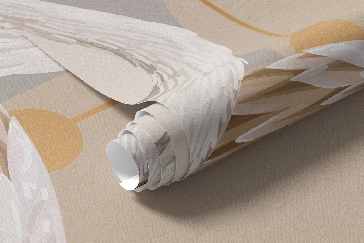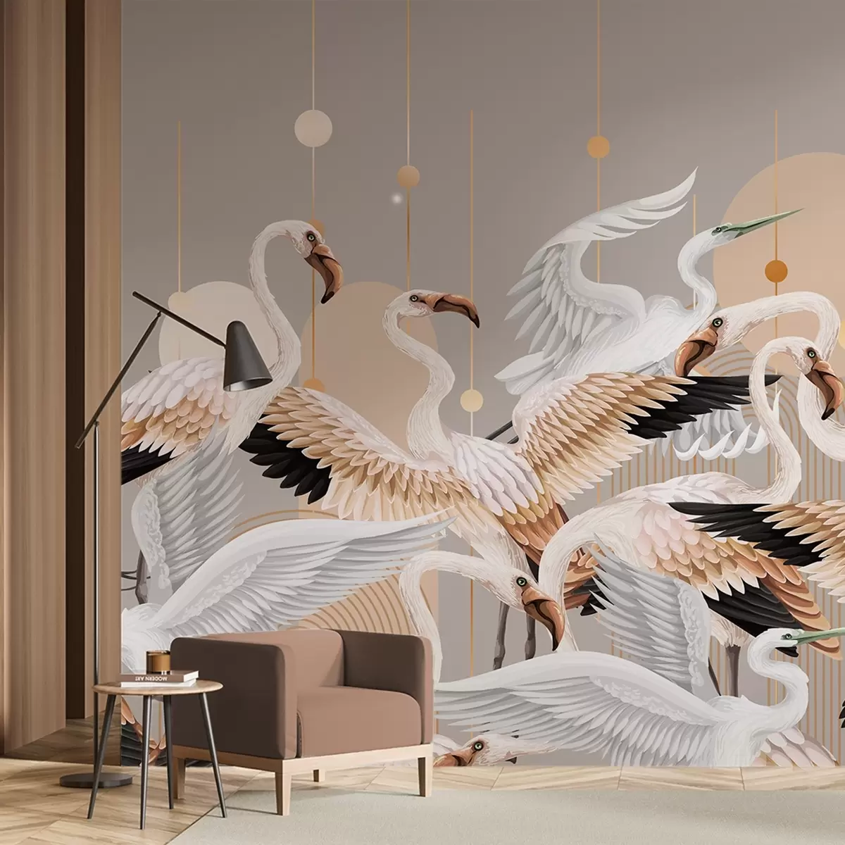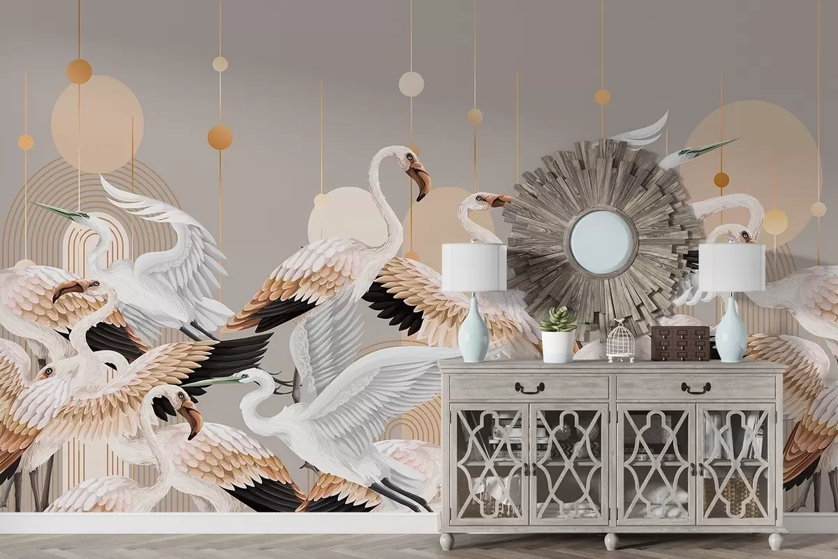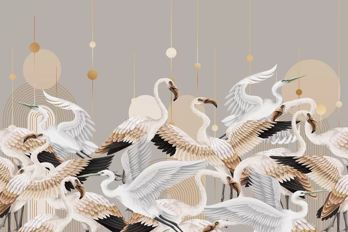 Fototapeter En flokk hvite flamingoer med delikate vinger, mot en nøytral bakgrunn med gule linjer og sirkler Nr. w09546v1