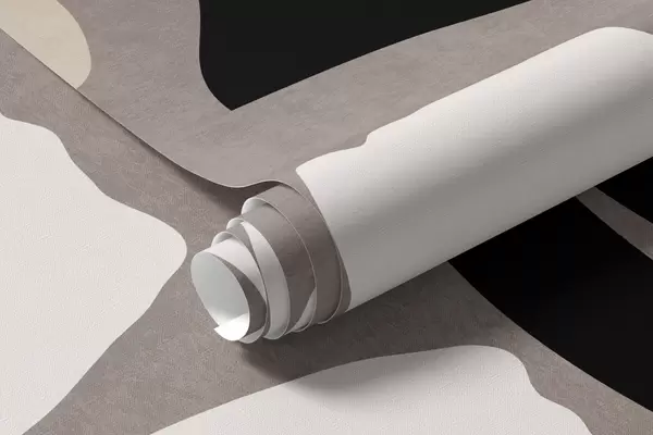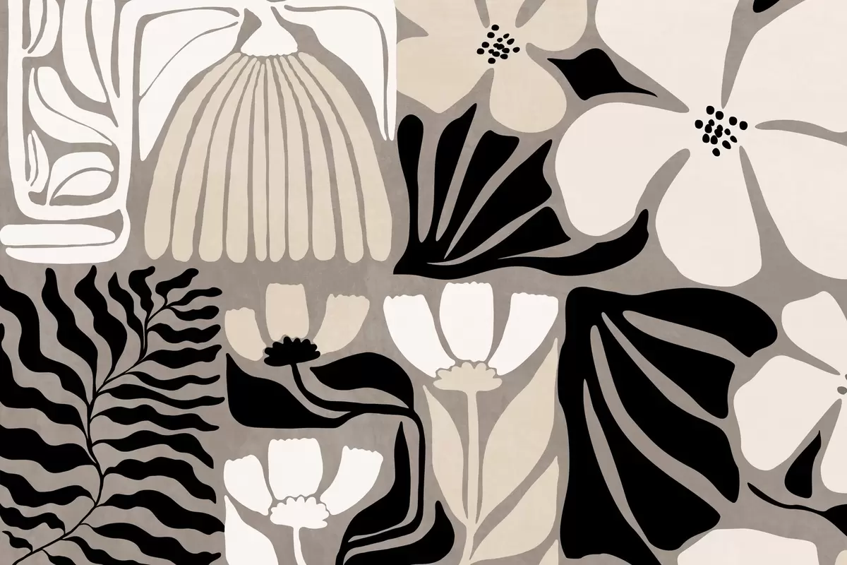 Fototapeter Moderne minimalistiske stiliserte blomster og blader i beige, svart og hvitt, med struktur på grå bakgrunn Nr. w09547