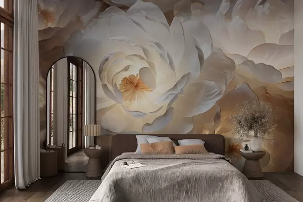 Fototapeter Store, hvite fantasifulle pionblomster med gule sentre, myk belysning og delikate, teksturerte lagdelte kronblader. Nr. w09550