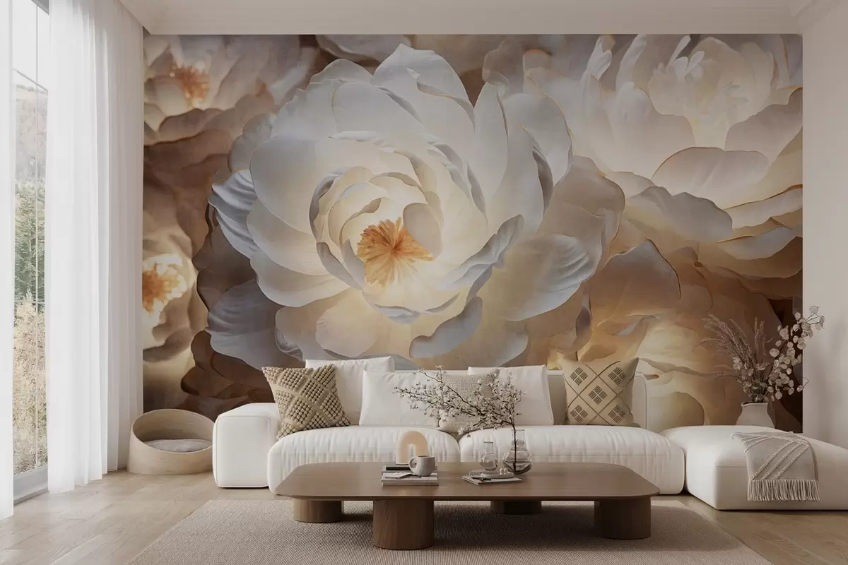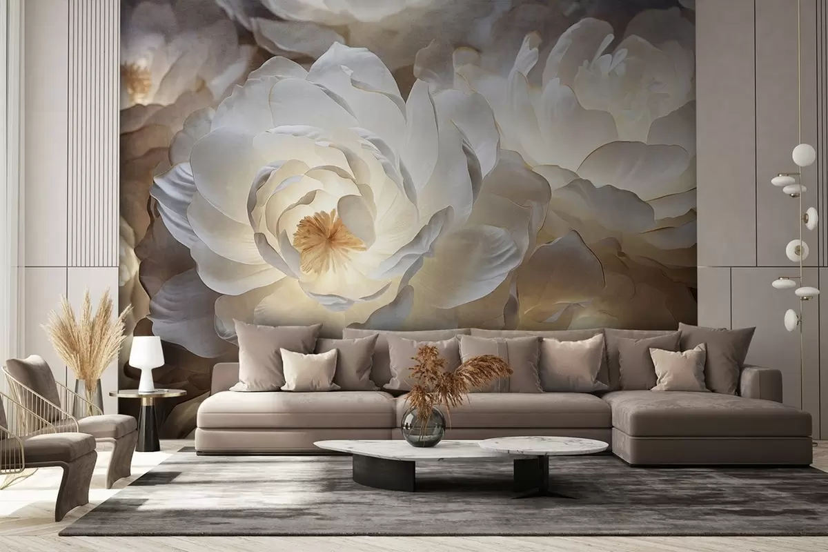 Fototapeter Store, hvite fantasifulle pionblomster med gule sentre, myk belysning og delikate, teksturerte lagdelte kronblader. Nr. w09550