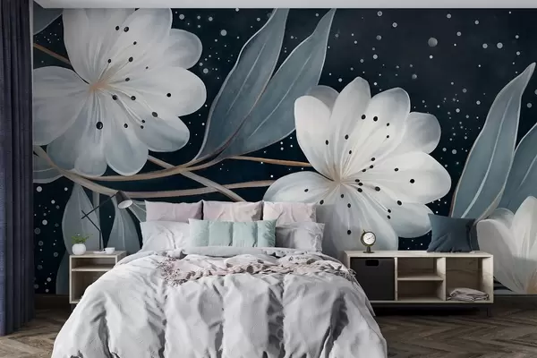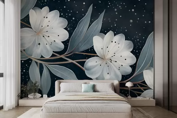 Fototapeter Fantastiske hvite blomster med struktur, omgitt av blågrønne blader og grener mot en mørk bakgrunn Nr. w09551