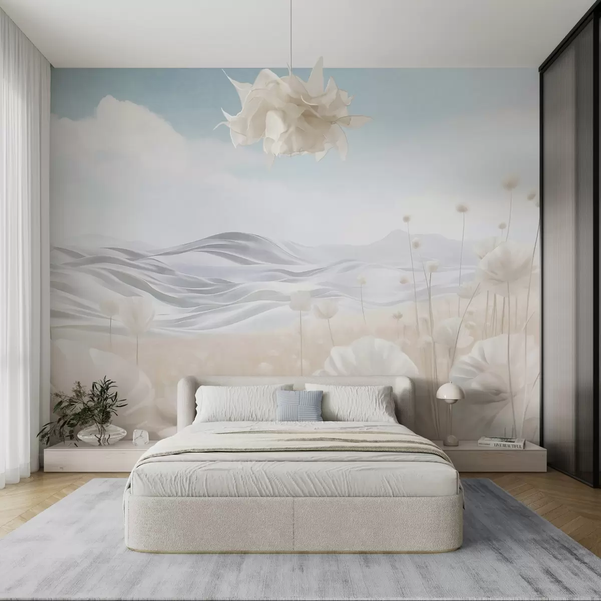 Fototapeter Teksturert felt med kremfargede valmuer og bølgende åser under en lyseblå himmel med myke skyer, pastellfarger Nr. w09553