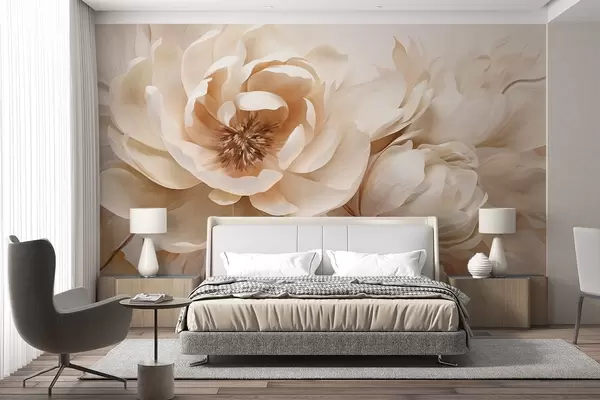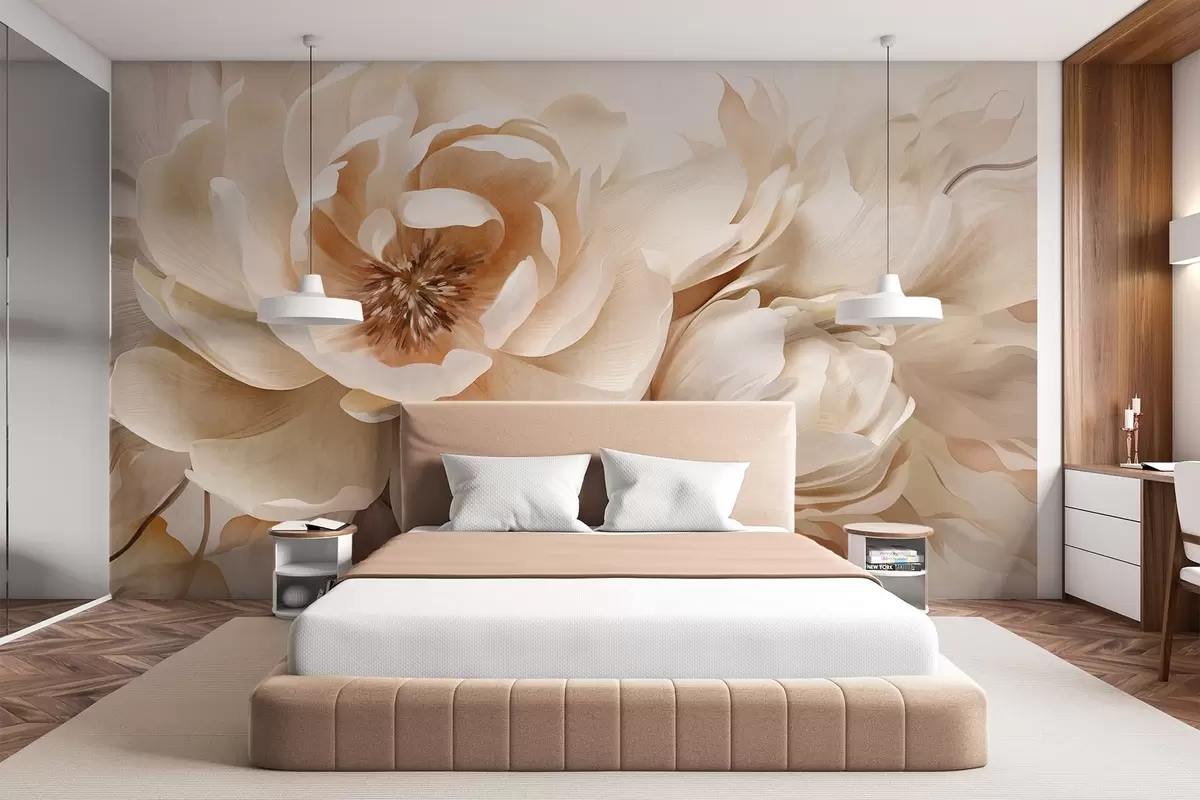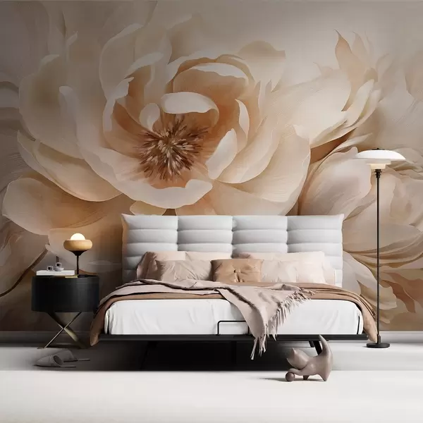 Fototapeter Kremete teksturerte pioner med brune sentre og blader på en uskarp, lys abstrakt bakgrunn Nr. w09554