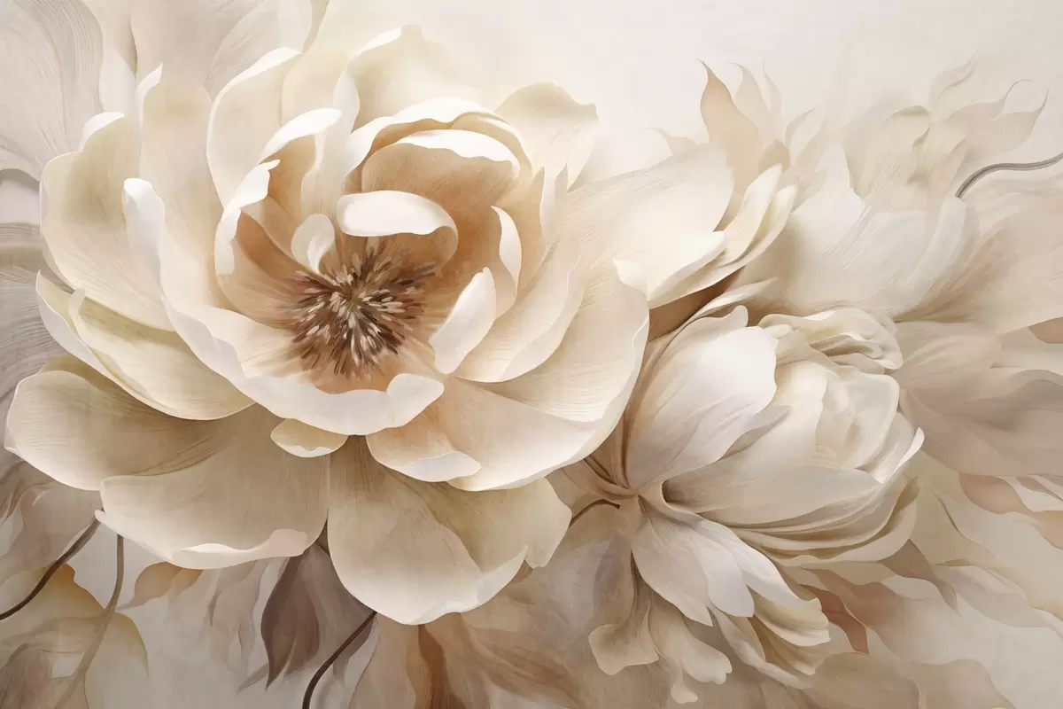 Fototapeter Kremete teksturerte pioner med brune sentre og blader på en uskarp, lys abstrakt bakgrunn Nr. w09554