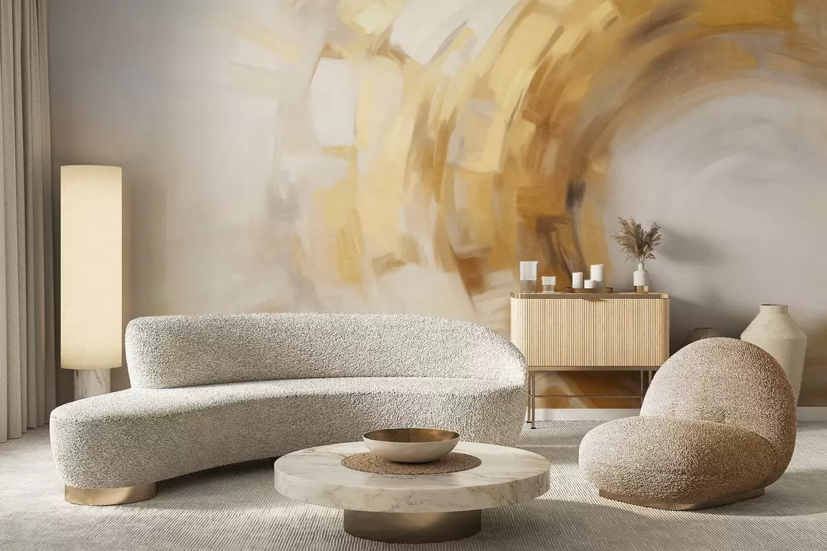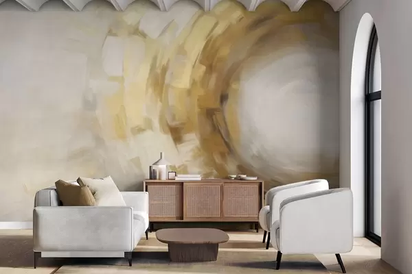 Fototapeter Abstrakt maleriimitasjon med sirkulære teksturerte penselstrøk i gult og hvitt, som skaper en følelse av bevegelse. Nr. w09558
