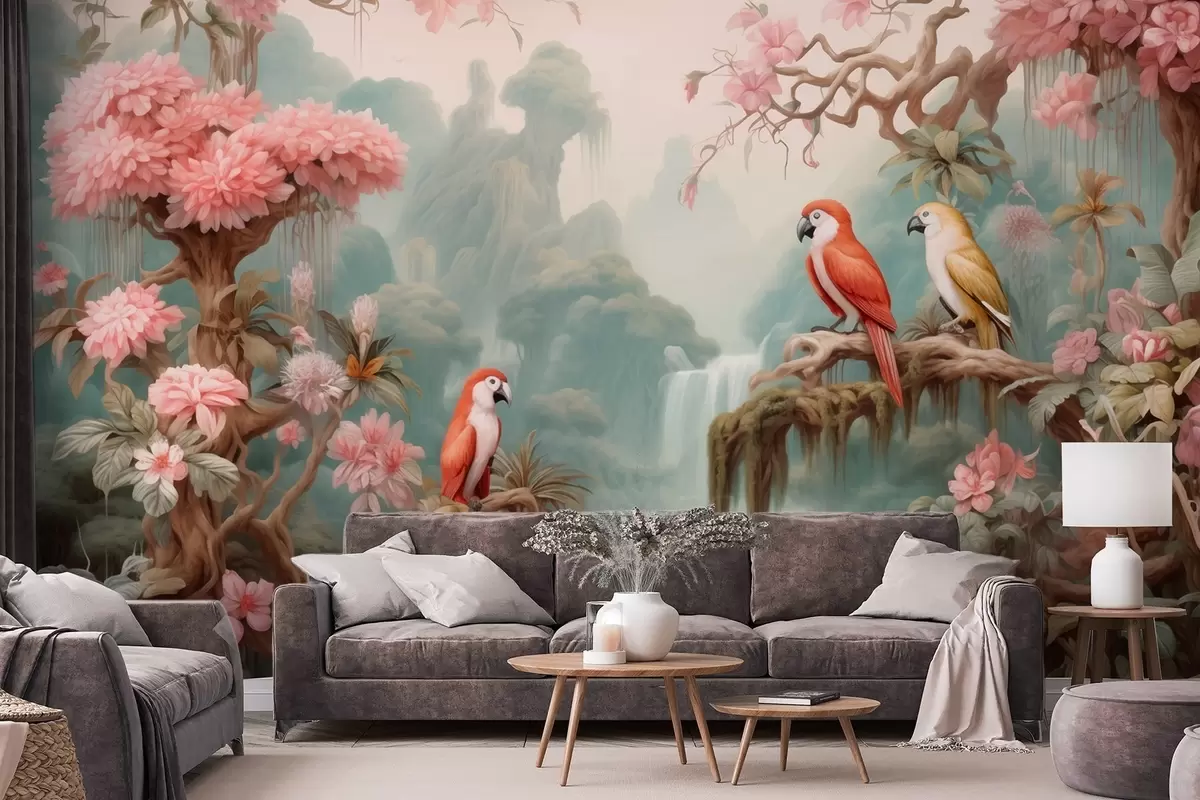 Fototapeter En eventyrlig tropisk skog med papegøyer, blomstrende trær med rosa blomster og en foss Nr. w09580