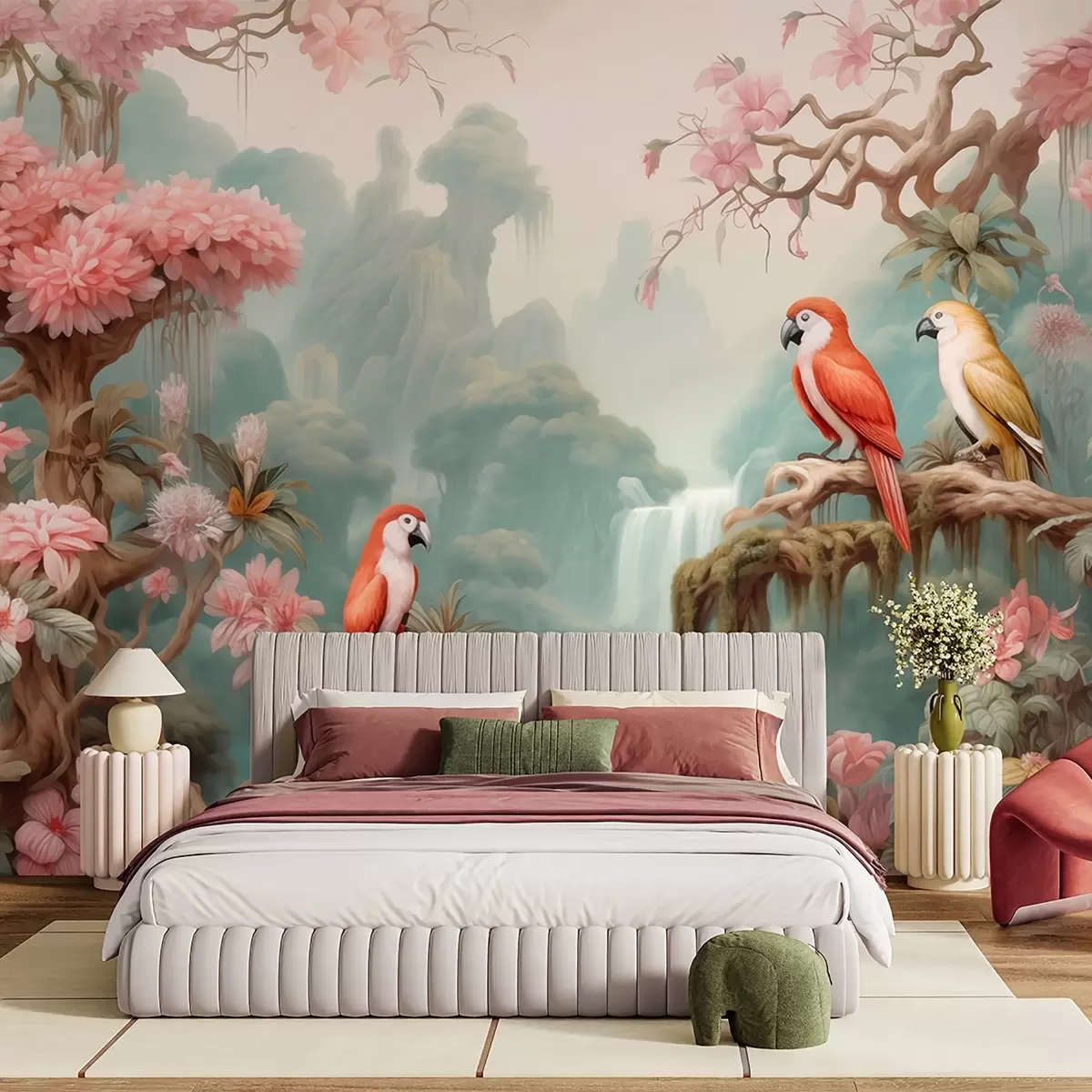 Fototapeter En eventyrlig tropisk skog med papegøyer, blomstrende trær med rosa blomster og en foss Nr. w09580