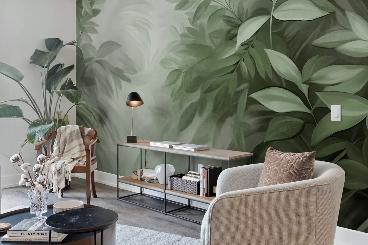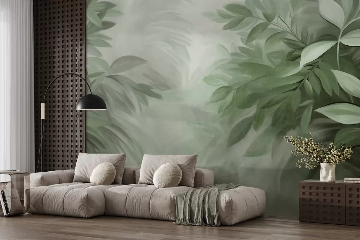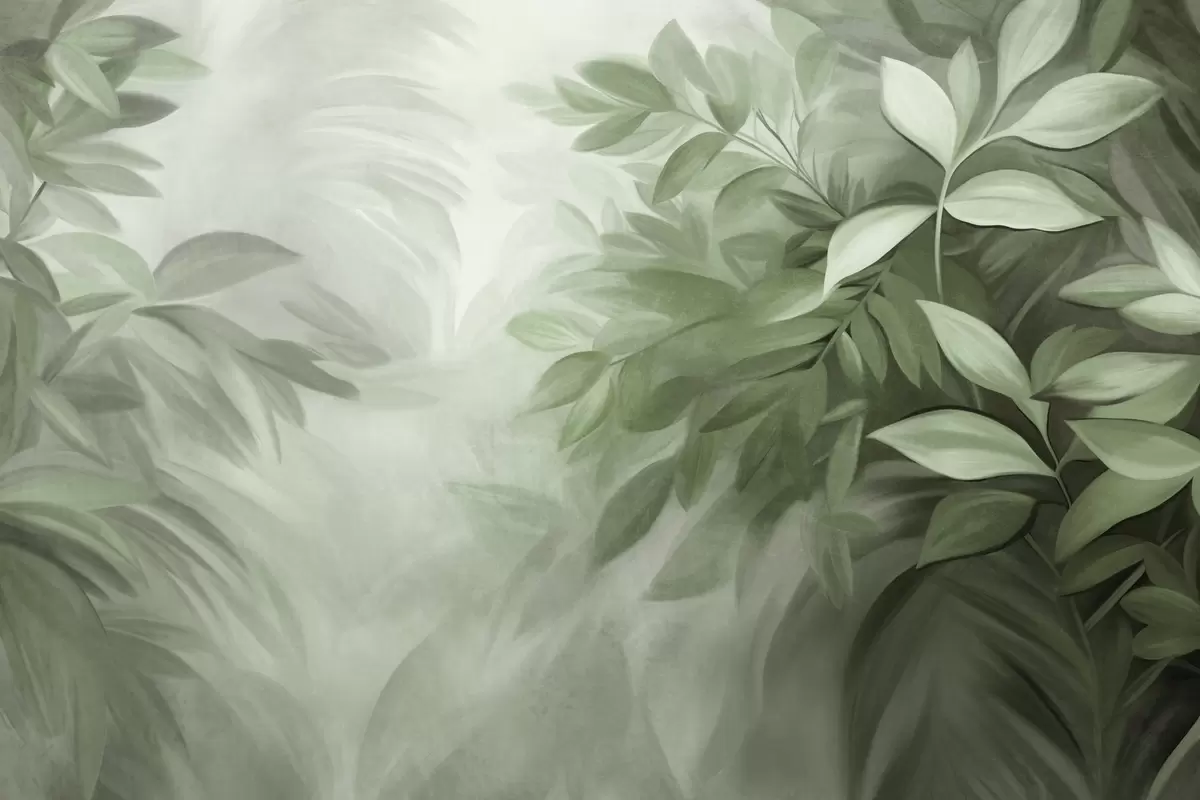 Fototapeter Grønne og grå blader med mykt, uskarpt teksturert løvverk, i en malerisk stil med synlige penselstrøk. Nr. w09584v1