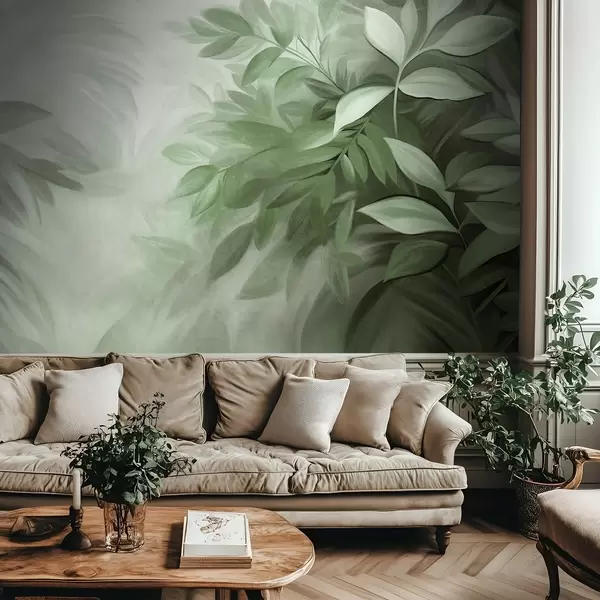 Fototapeter Grønne og grå blader med mykt, uskarpt teksturert løvverk, i en malerisk stil med synlige penselstrøk Nr. w09584v1