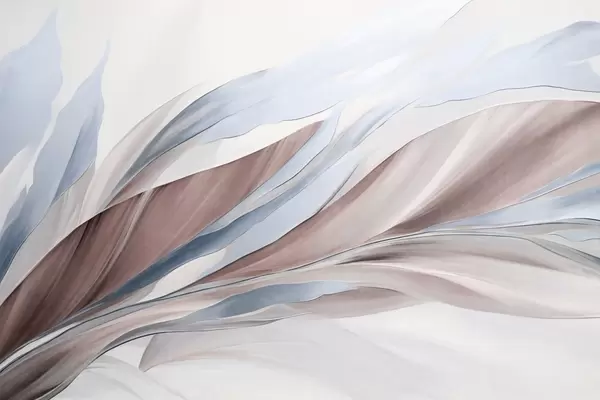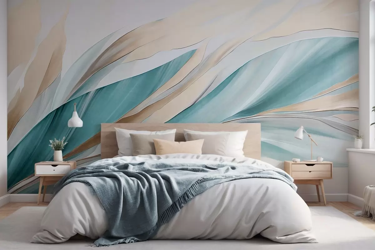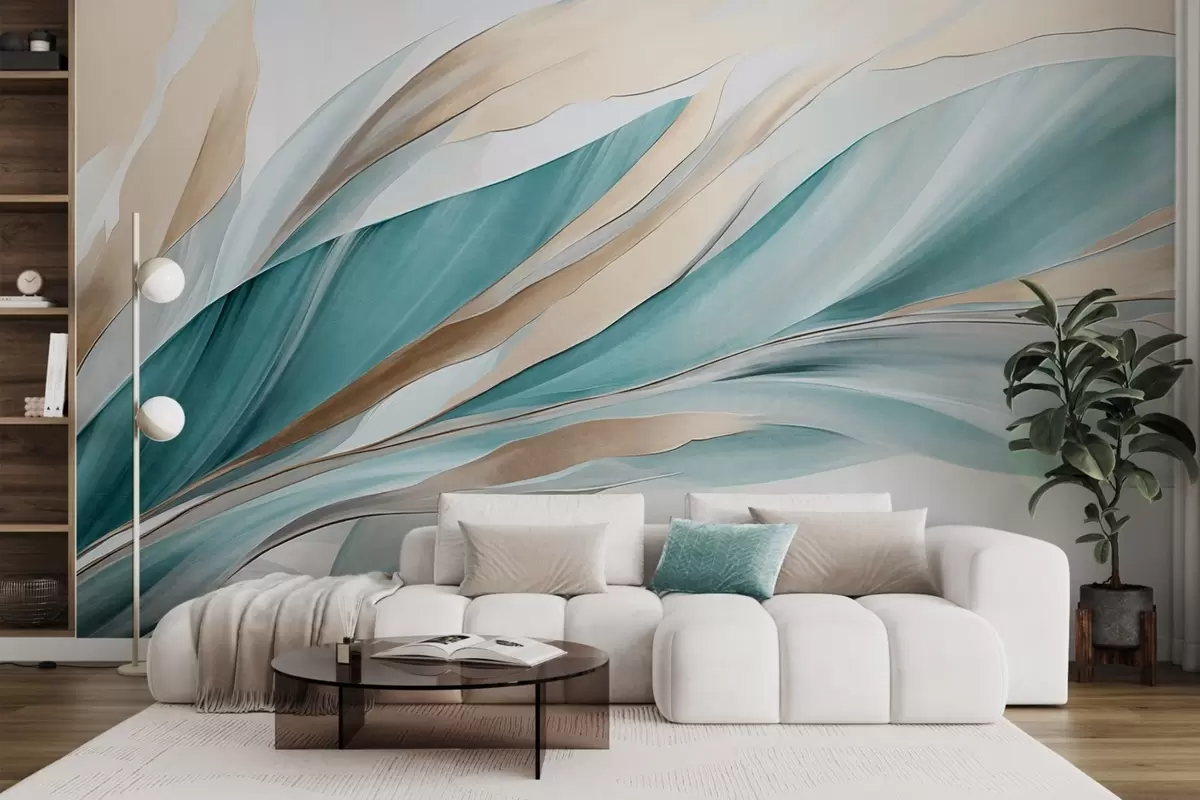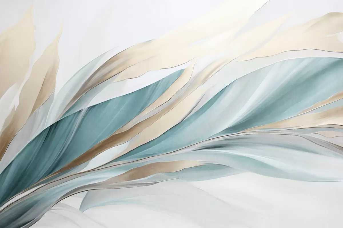 Fototapeter Abstrakte bølger i blågrønn og gul, med tynne former og linjer, mot en hvit bakgrunn, strukturert kunst Nr. w09585