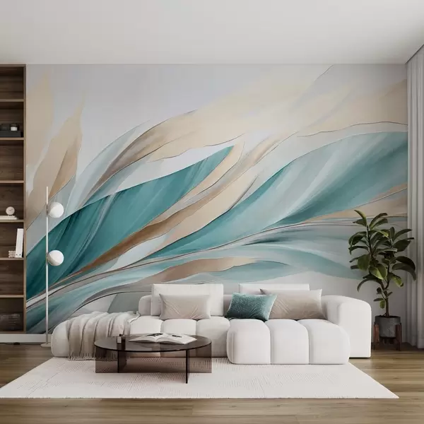 Fototapeter Abstrakte bølger i blågrønn og gul, med tynne former og linjer, mot en hvit bakgrunn, strukturert kunst Nr. w09585