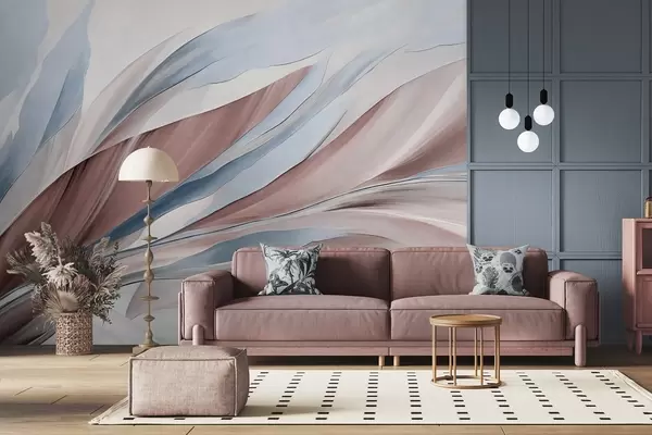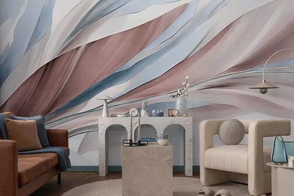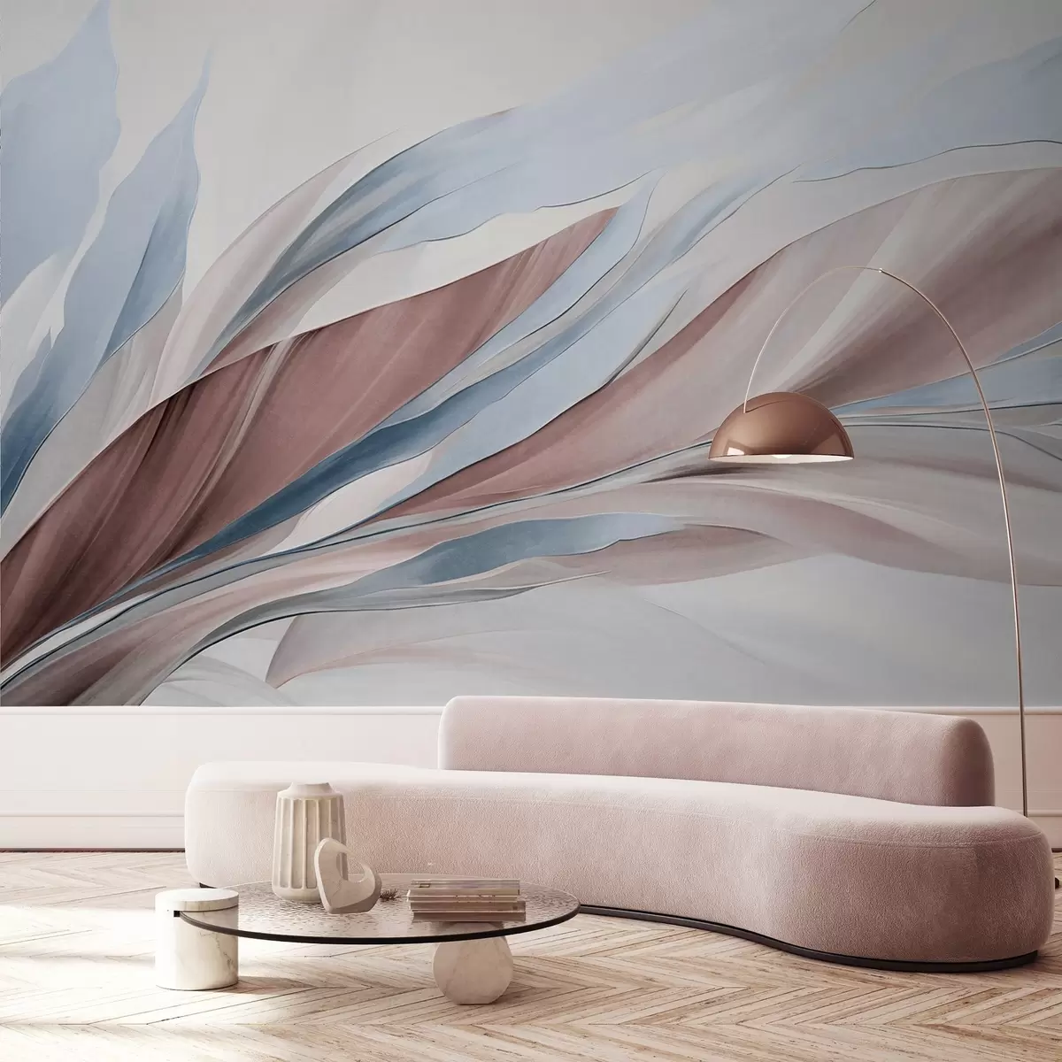 Fototapeter Abstrakte bølger i blått og brunt, med tynne former og linjer, mot en hvit bakgrunn, strukturert kunst Nr. w09585v1