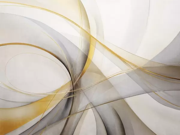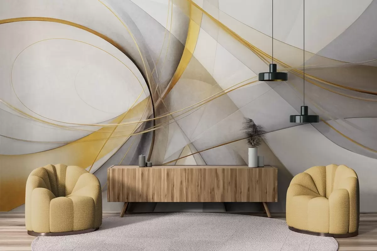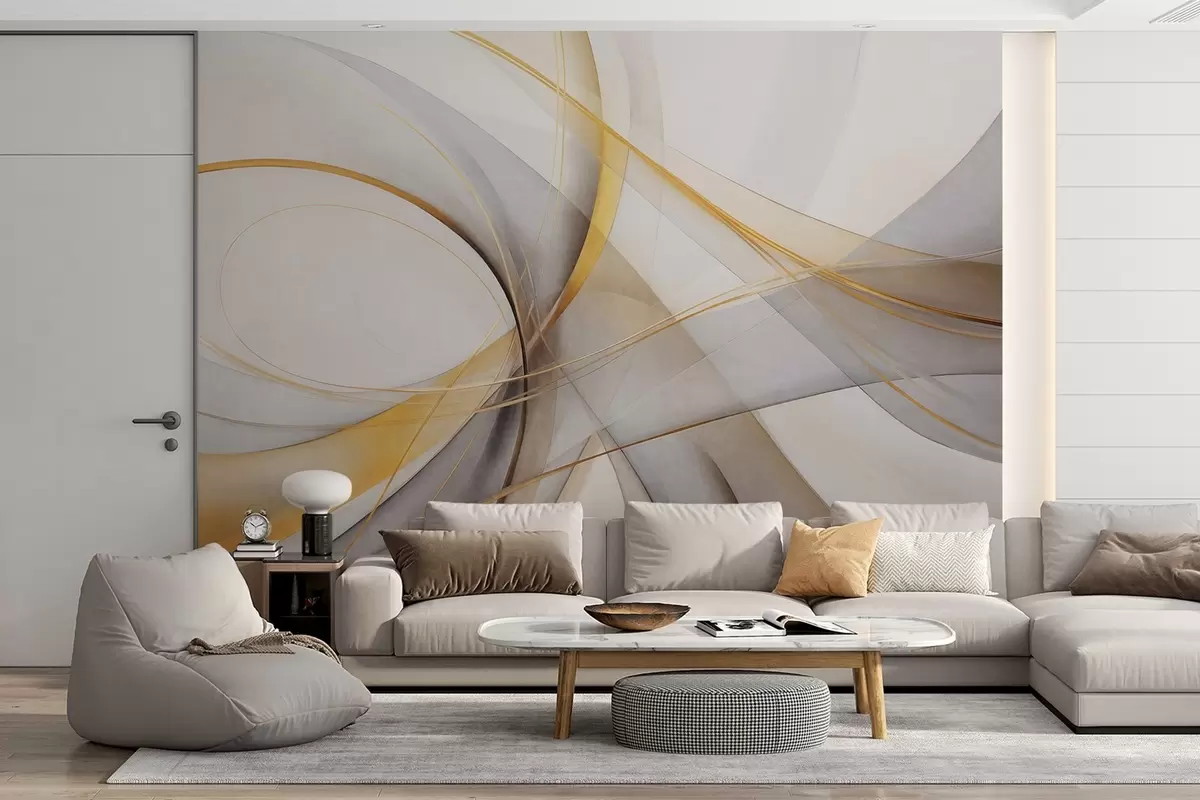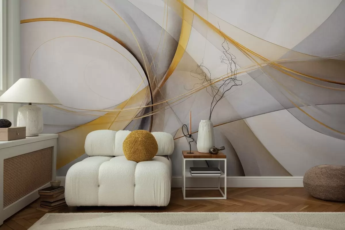 Fototapeter Abstrakte flytende linjer i gult og hvitt på grå bakgrunn, med en følelse av bevegelse og dybde, moderne kunst Nr. w09587