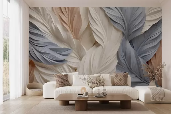 fototapeter Abstrakte, lagdelte fjær i krem-, beige- og lyseblå nyanser, med et strukturert, organisk utseende. w09603
