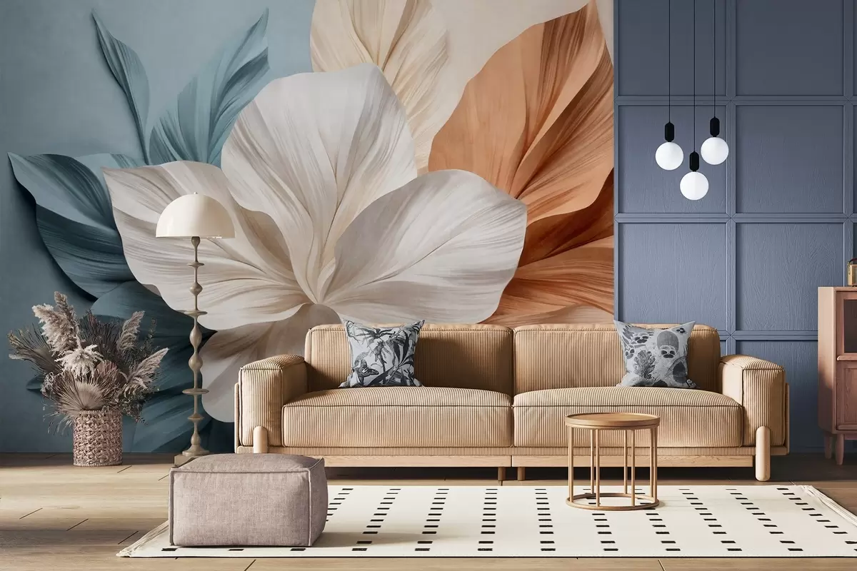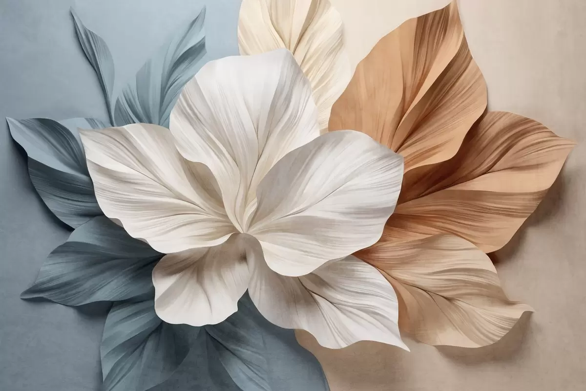 Fototapeter Abstrakt blomst med flere kronblader og strukturerte blader i fargene fersken og blå, myk bakgrunn Nr. w09604