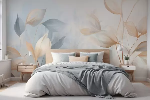 fototapeter Myke, delikate, gjennomsiktige blader i dempede nyanser av beige, fersken og blekblått, strukturert pastellkunst w09607