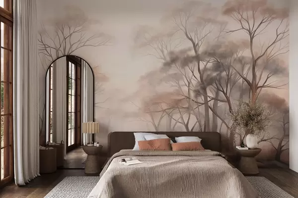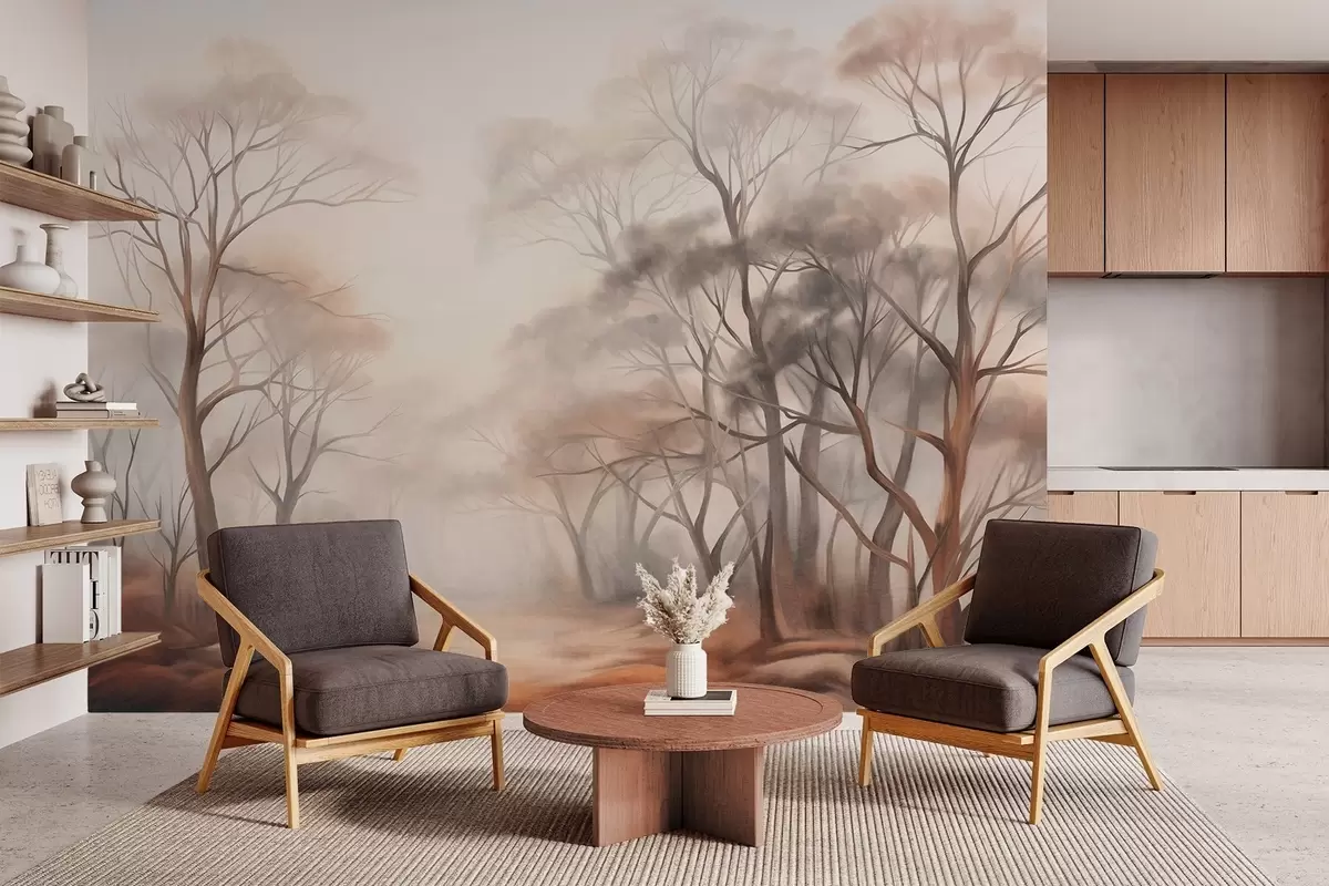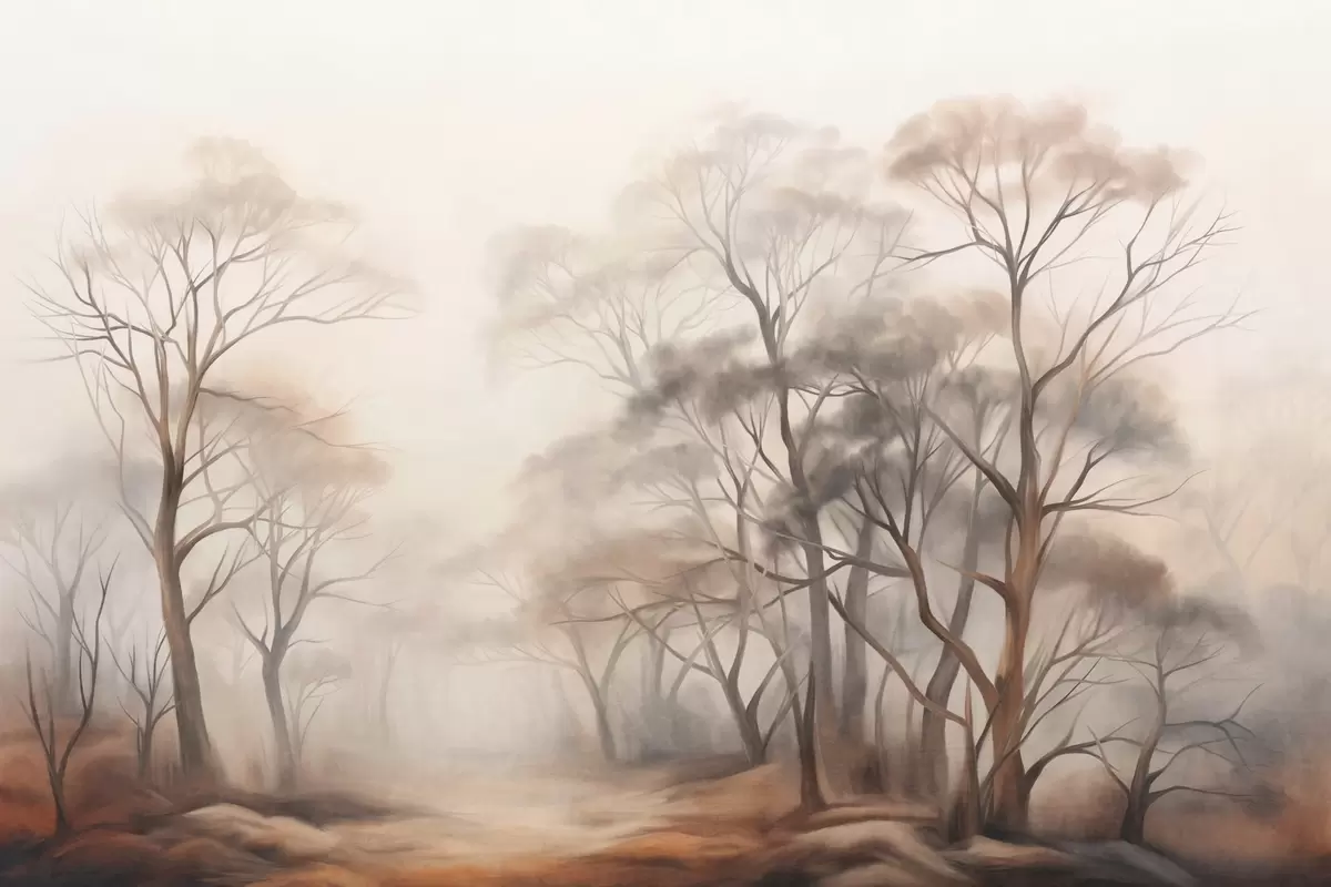 Fototapeter Teksturerte trær i en disig skog, tåkete landskap med dempede farger og mild belysning Nr. w09609