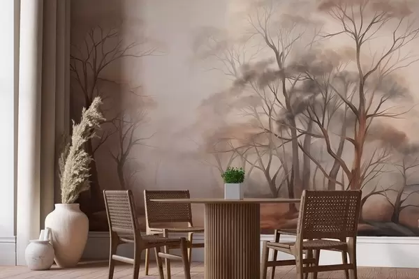 Fototapeter Teksturerte trær i en disig skog, tåkete landskap med dempede farger og mild belysning Nr. w09609