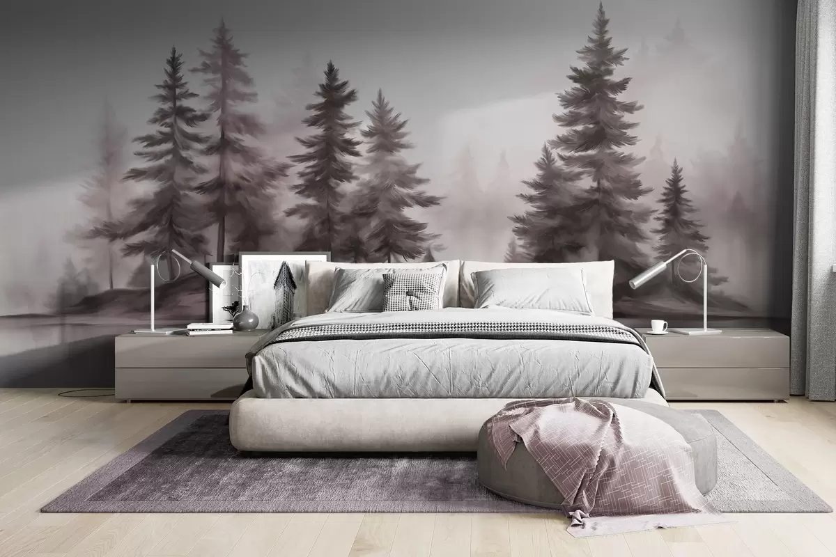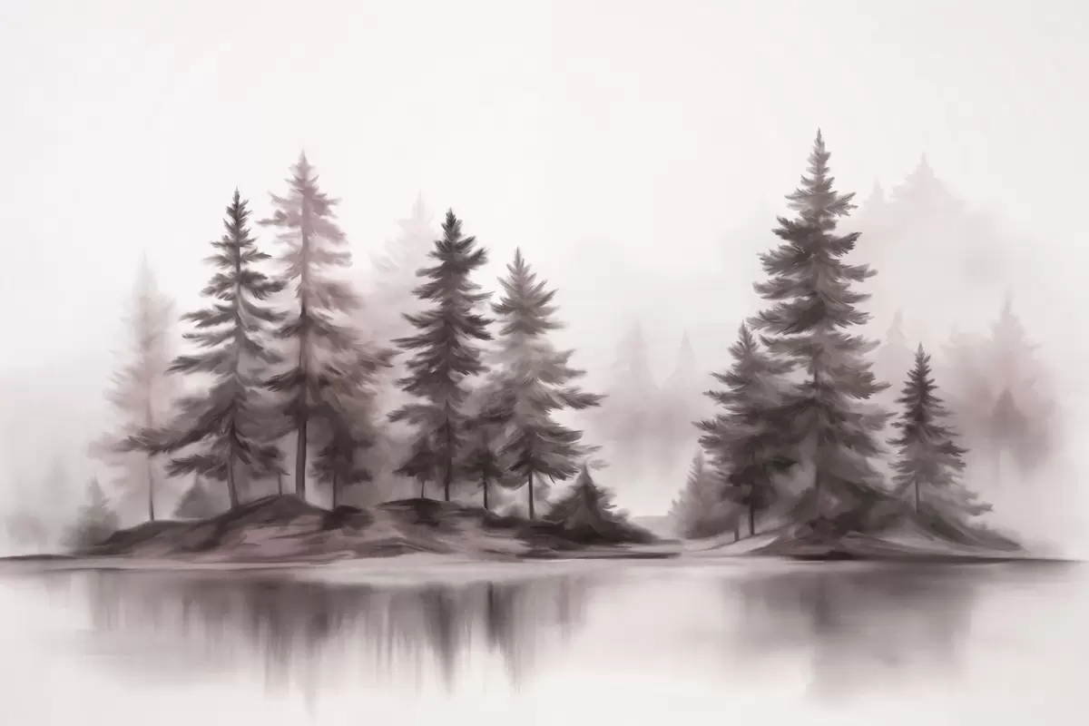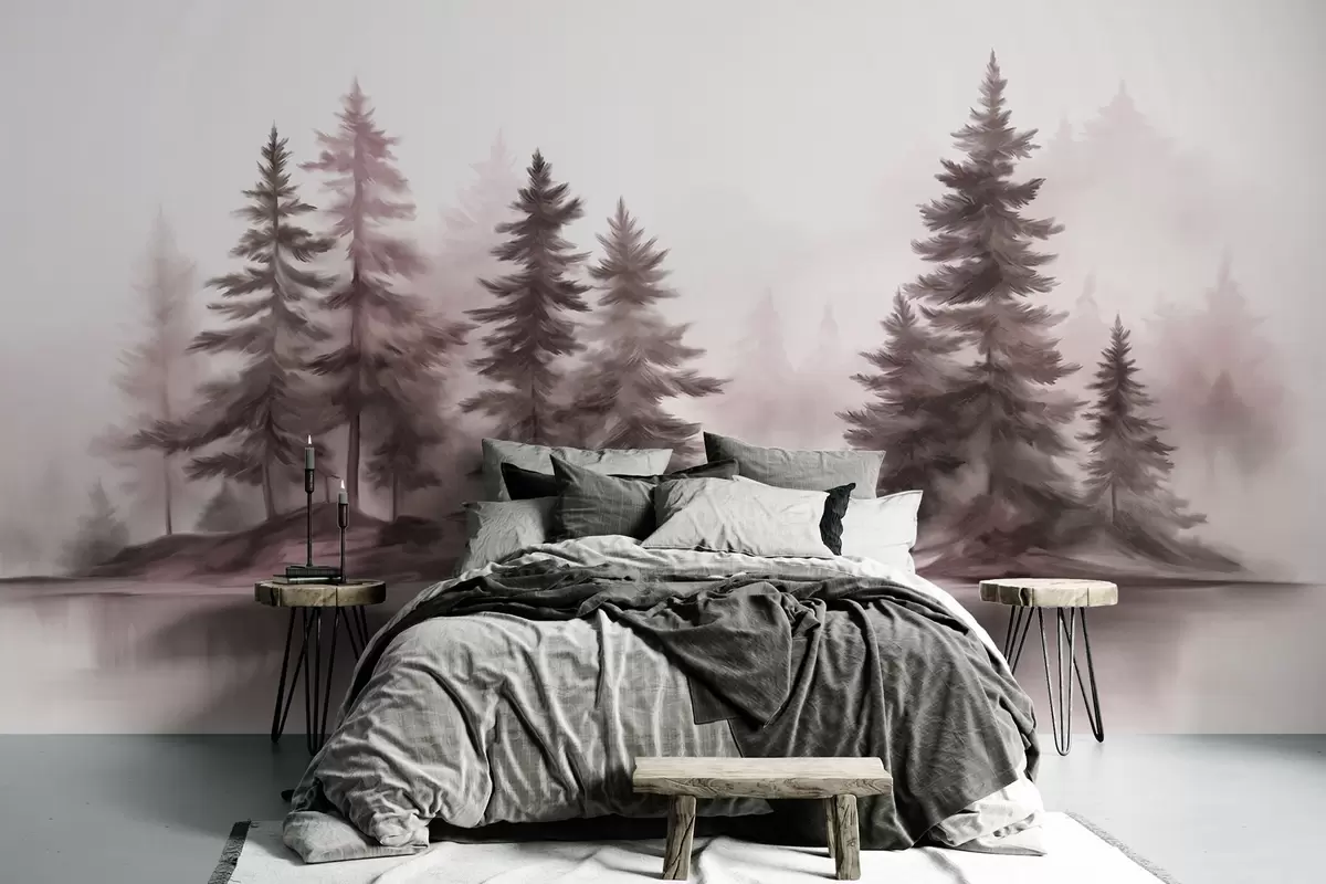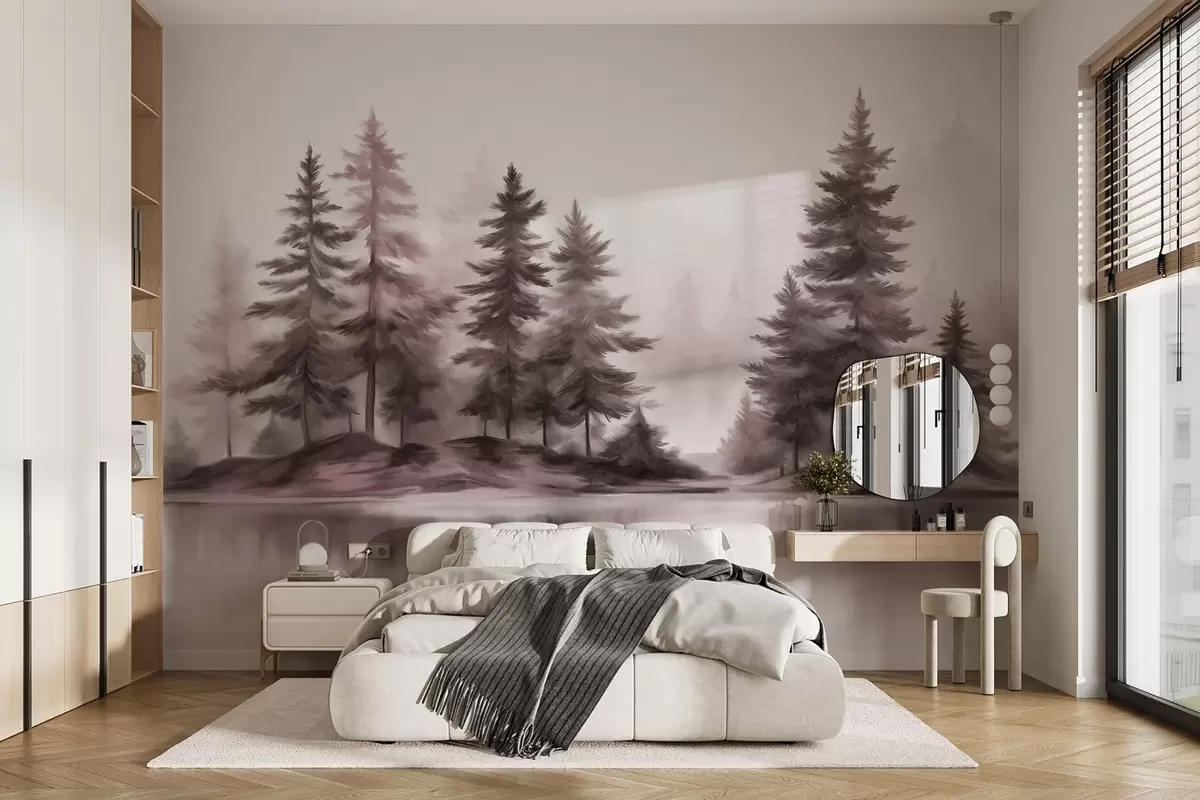 Fototapeter En strukturert, tåkete skog med høye furutrær, maleriimitasjon Nr. w09610v1