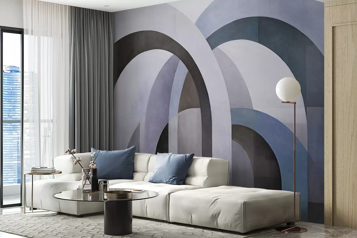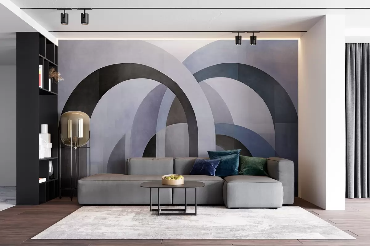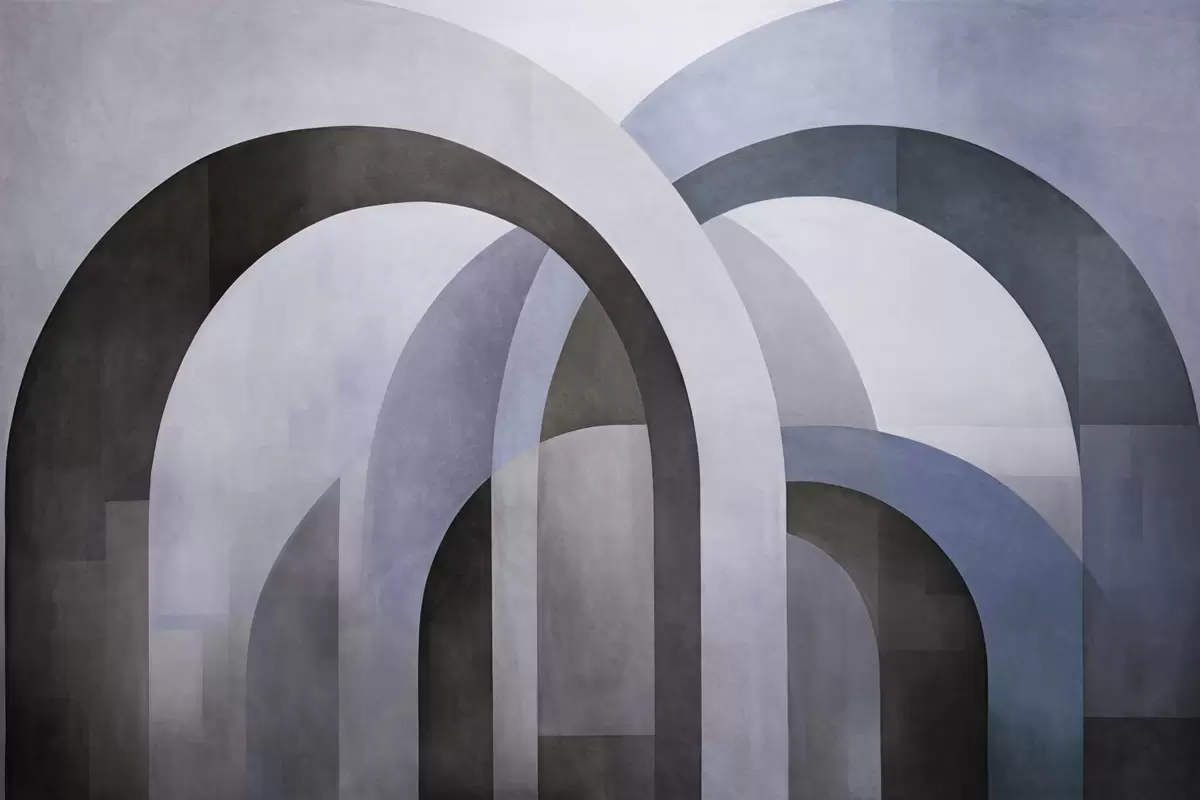 Fototapeter Abstrakte, strukturerte geometriske buer i blå, svarte og grå toner, et lagdelt, moderne arkitektonisk design Nr. w09611v1