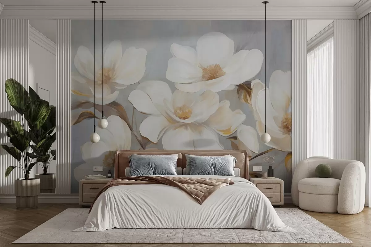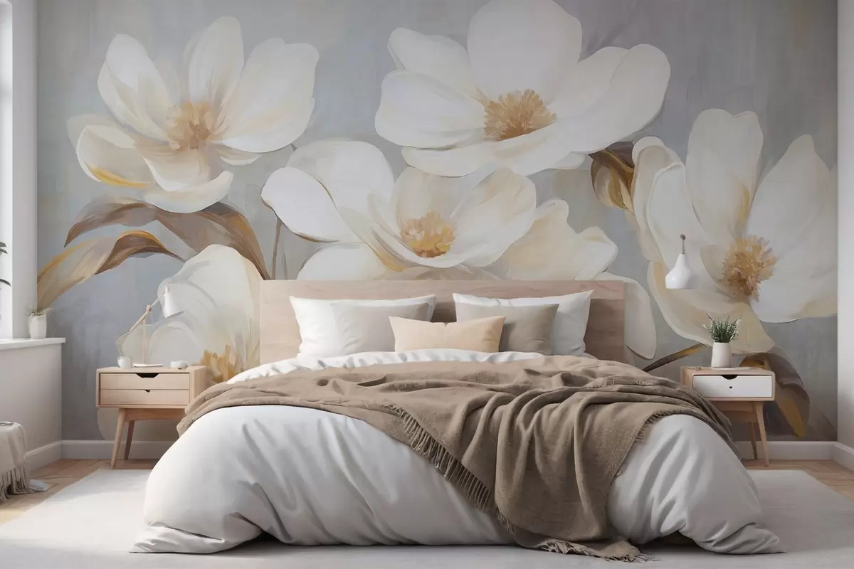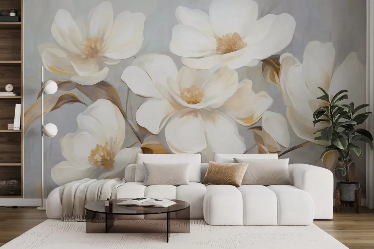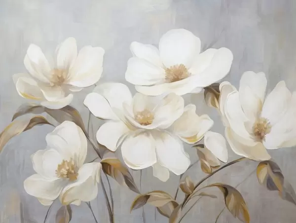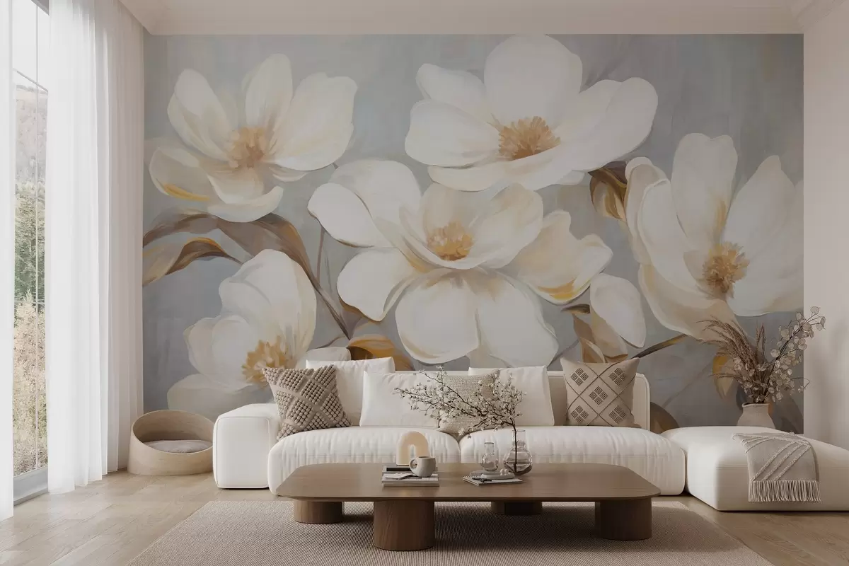 Fototapeter Et strukturert maleri som imiterer flere hvite magnoliablomster mot en dempet pastellbakgrunn. Nr. w09612