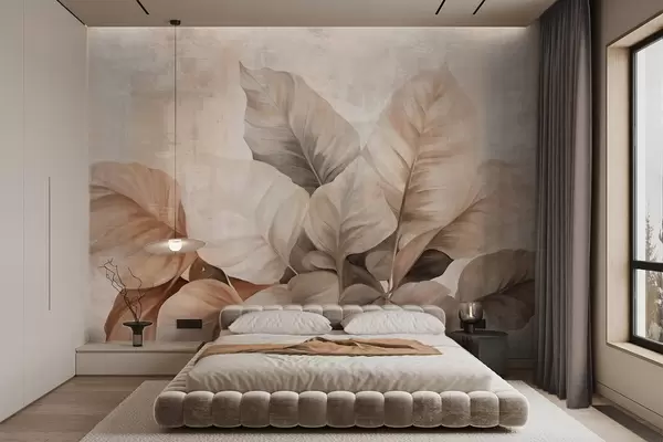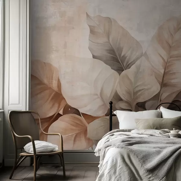 Fototapeter Teksturert maleri som imiterer store, lysebrune blader mot en nøytral bakgrunn med subtile penselstrøk. Nr. w09614