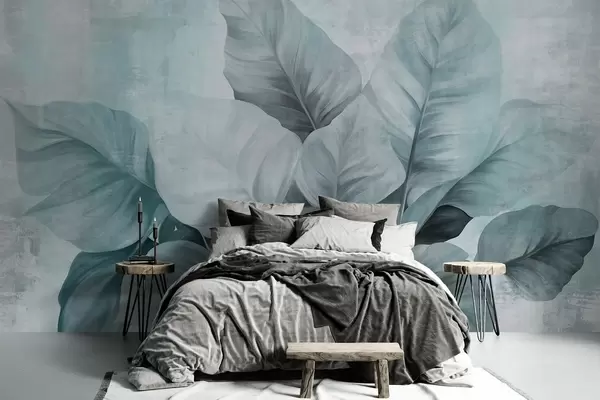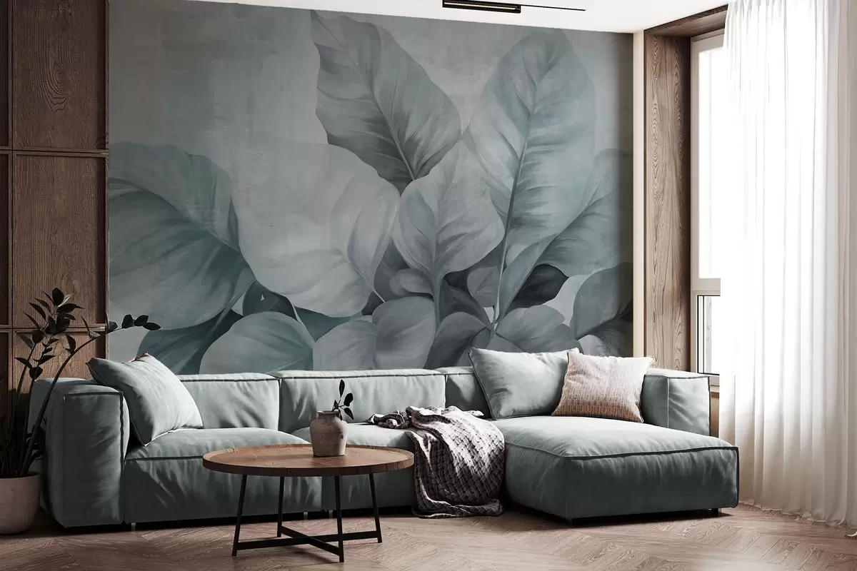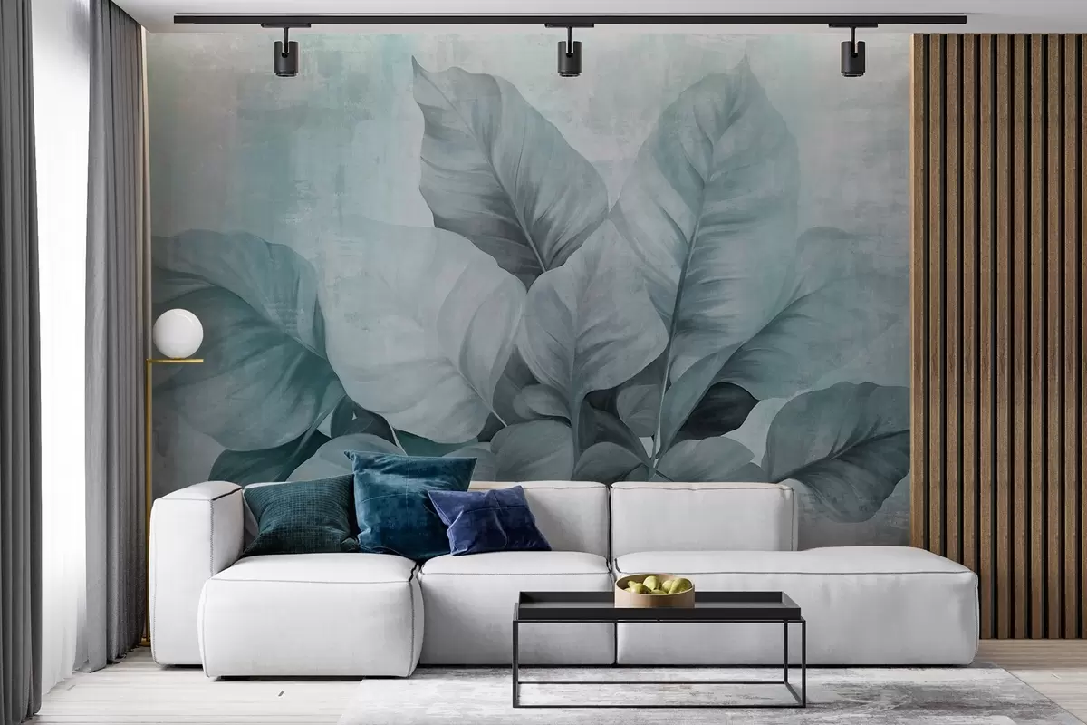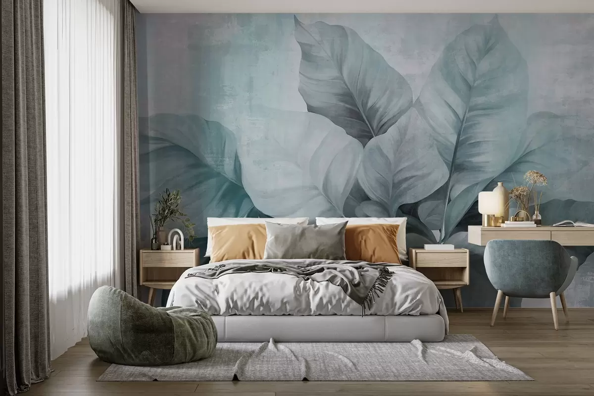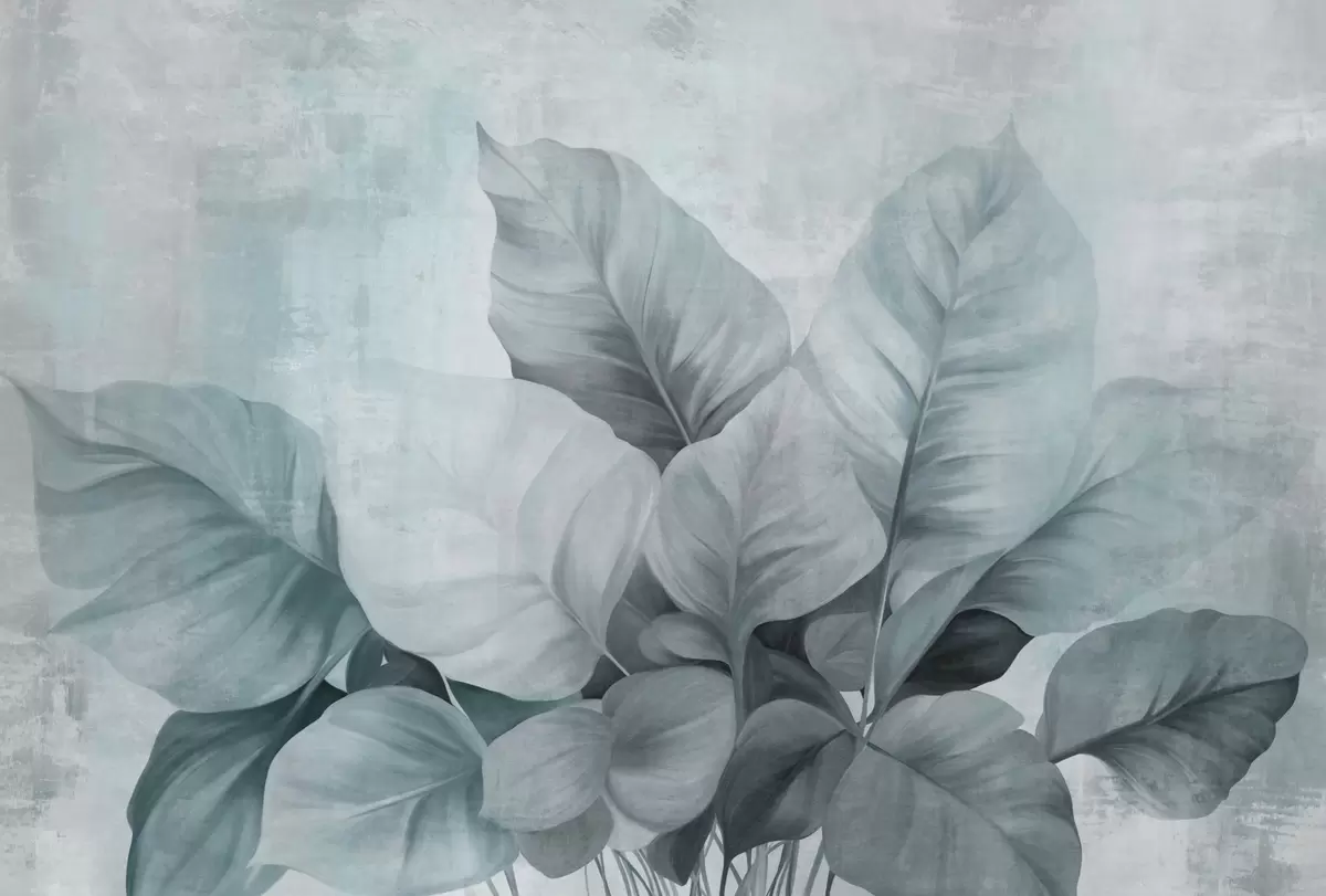 Fototapeter Teksturert maleri som imiterer store, lyseblå blader mot en nøytral bakgrunn med subtile penselstrøk. Nr. w09614v2