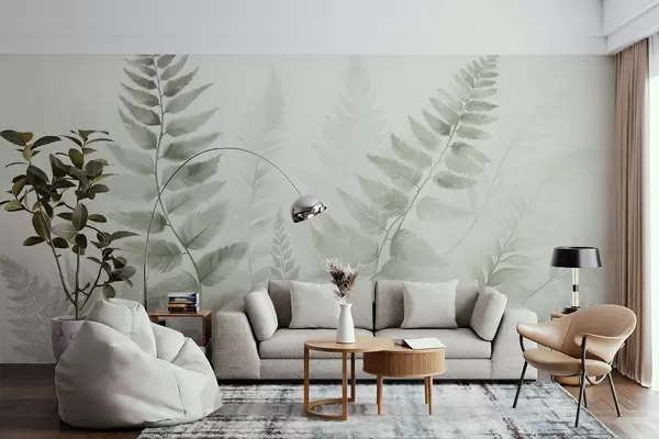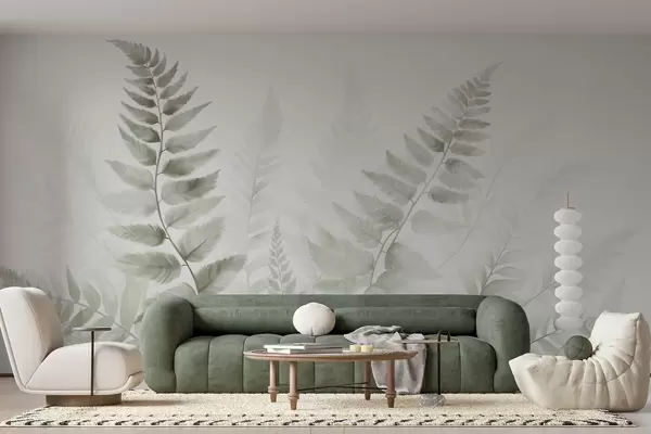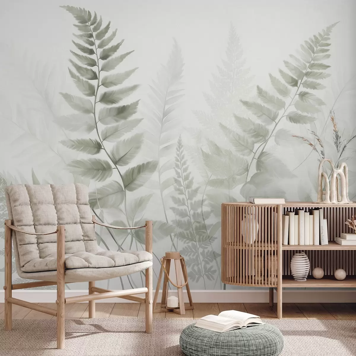Fototapeter Teksturerte tørkede bregneblader i ulike nyanser av grønt, med en myk, lys bakgrunn i akvarellstil. Nr. w09615v1
