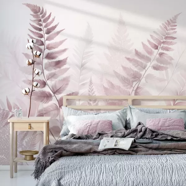 Fototapeter Teksturerte tørkede bregneblader i ulike nyanser av rosa, med en myk, lys bakgrunn i akvarellstil. Nr. w09615v2