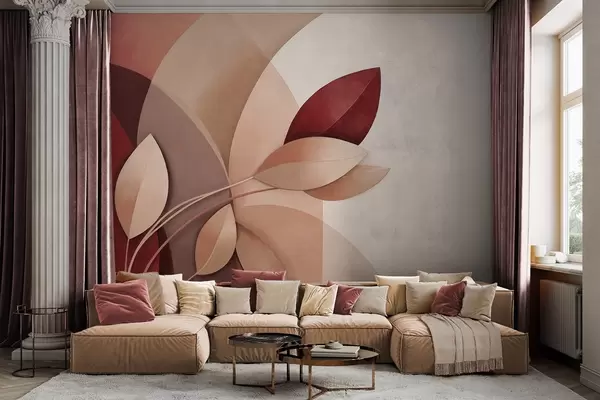 Fototapeter Abstrakt teksturert gren med blader i nyanser av brunt, beige og rødt, mot en bakgrunn av abstrakte former Nr. w09618