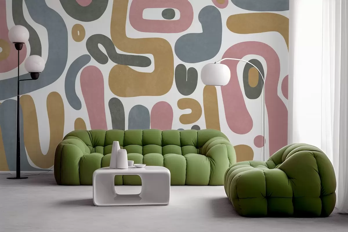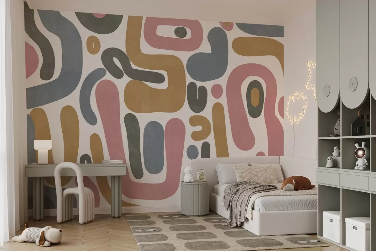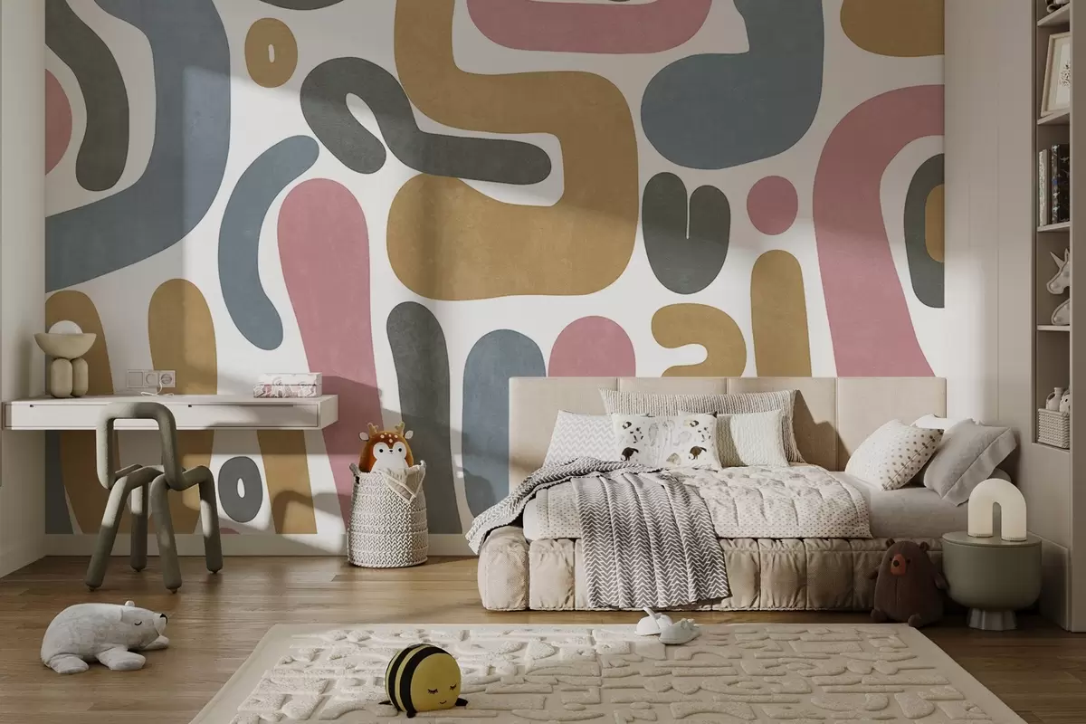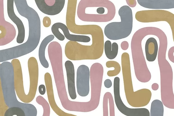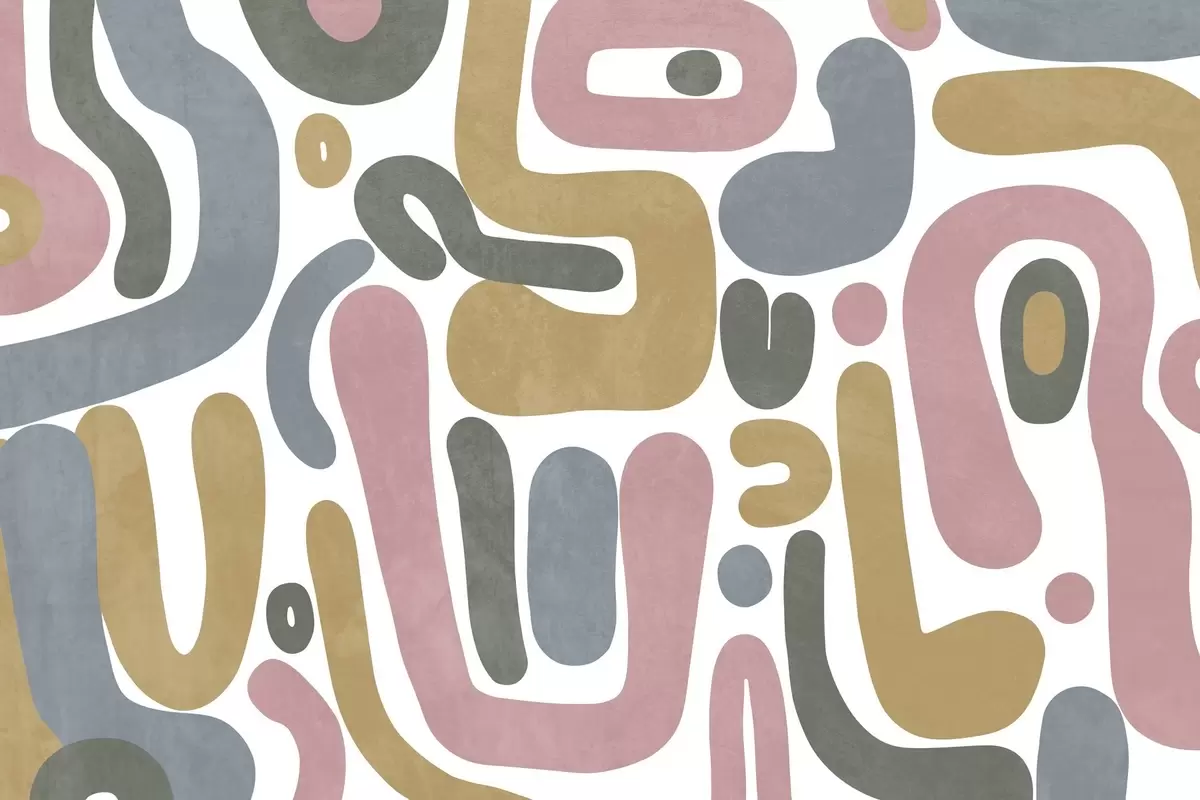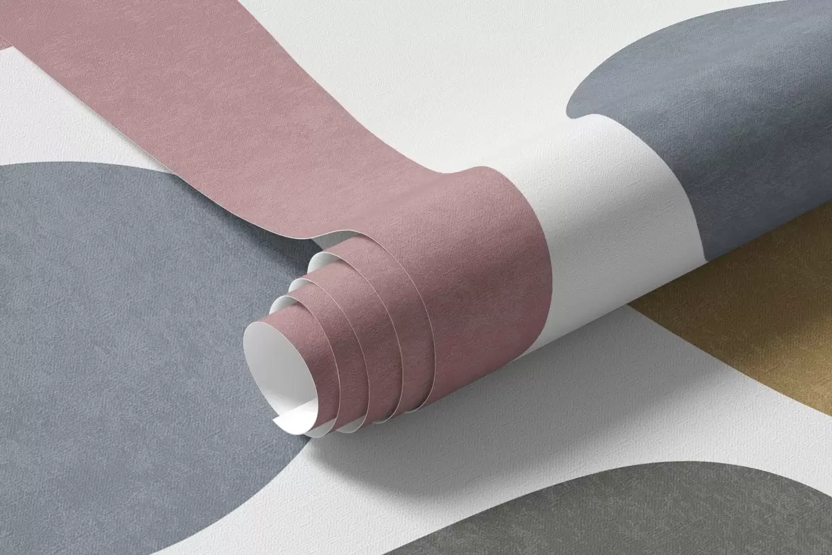 Fototapeter Abstrakte teksturerte former i pastellrosa, dempet blått, sennepsgult og grått på hvit bakgrunn moderne kunst Nr. w09620
