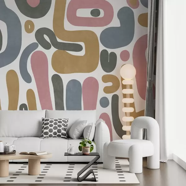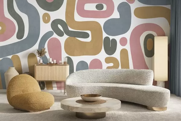 Fototapeter Abstrakte teksturerte former i pastellrosa, dempet blått, sennepsgult og grått på hvit bakgrunn moderne kunst Nr. w09620