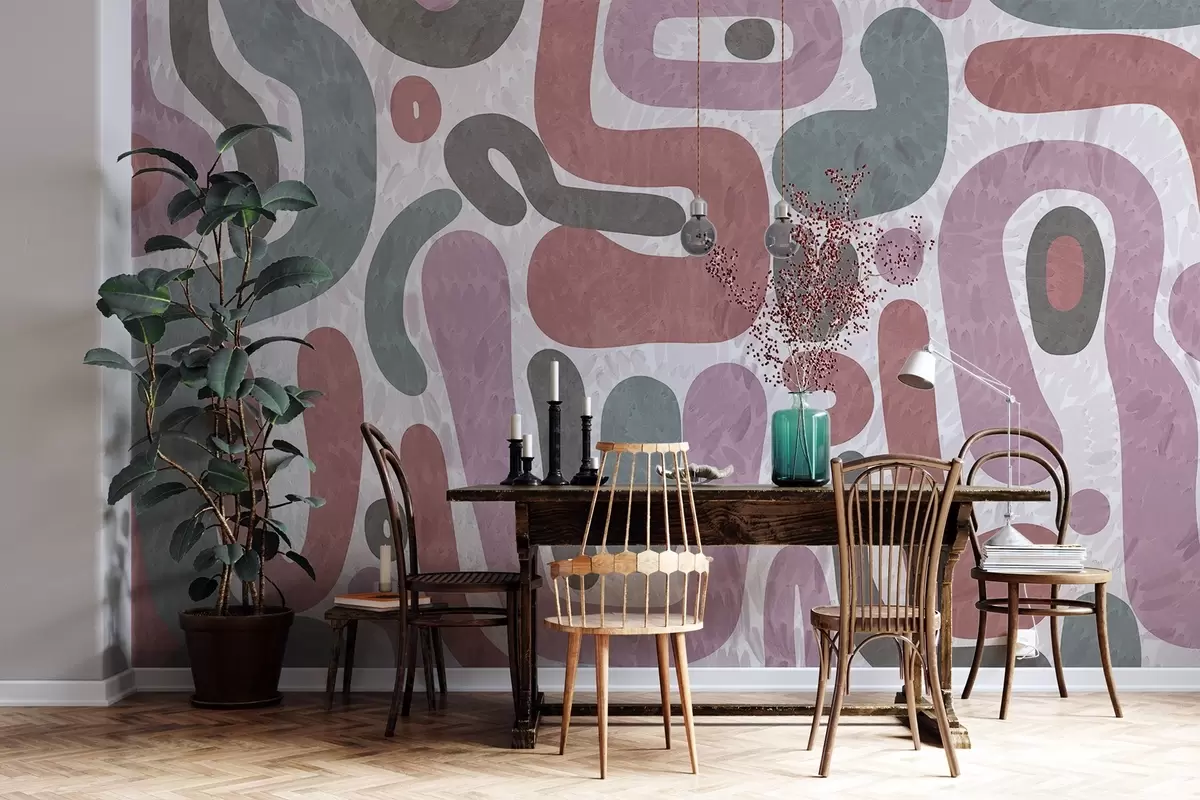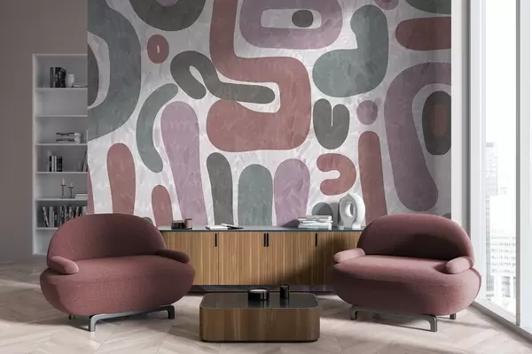 Fototapeter Abstrakte teksturerte former i dempede rosa, grønne og grå toner, på en teksturert bakgrunn moderne kunst Nr. w09622