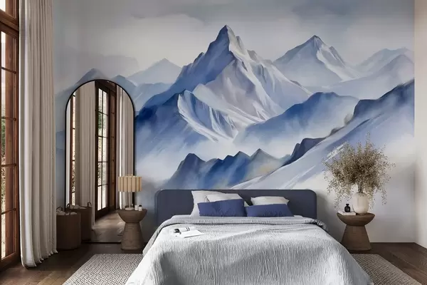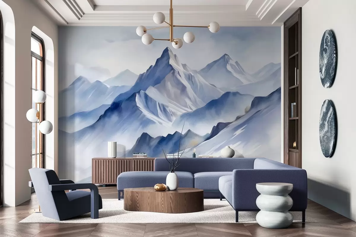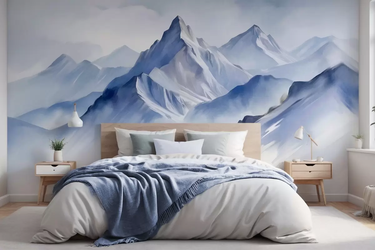 Fototapeter Teksturerte snødekte fjell med en myk akvarelleffekt og en palett av blått og hvitt Nr. w09630