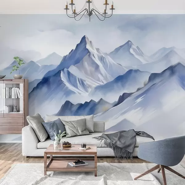Fototapeter Teksturerte snødekte fjell med en myk akvarelleffekt og en palett av blått og hvitt Nr. w09630